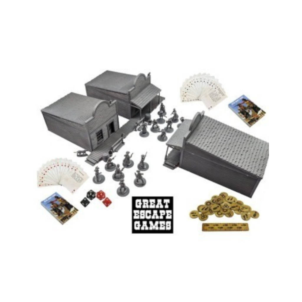 - Livre de règles Dead Man's Hand, marqueurs, dés et cartes- 10 tireurs masculins en plastique avec socles- 5 tireuses féminines en plastique avec socles- 3 bâtiments en plastique entièrement détaillés- 1 groupe de trottoirs- 1 groupe d'accessoires de rue