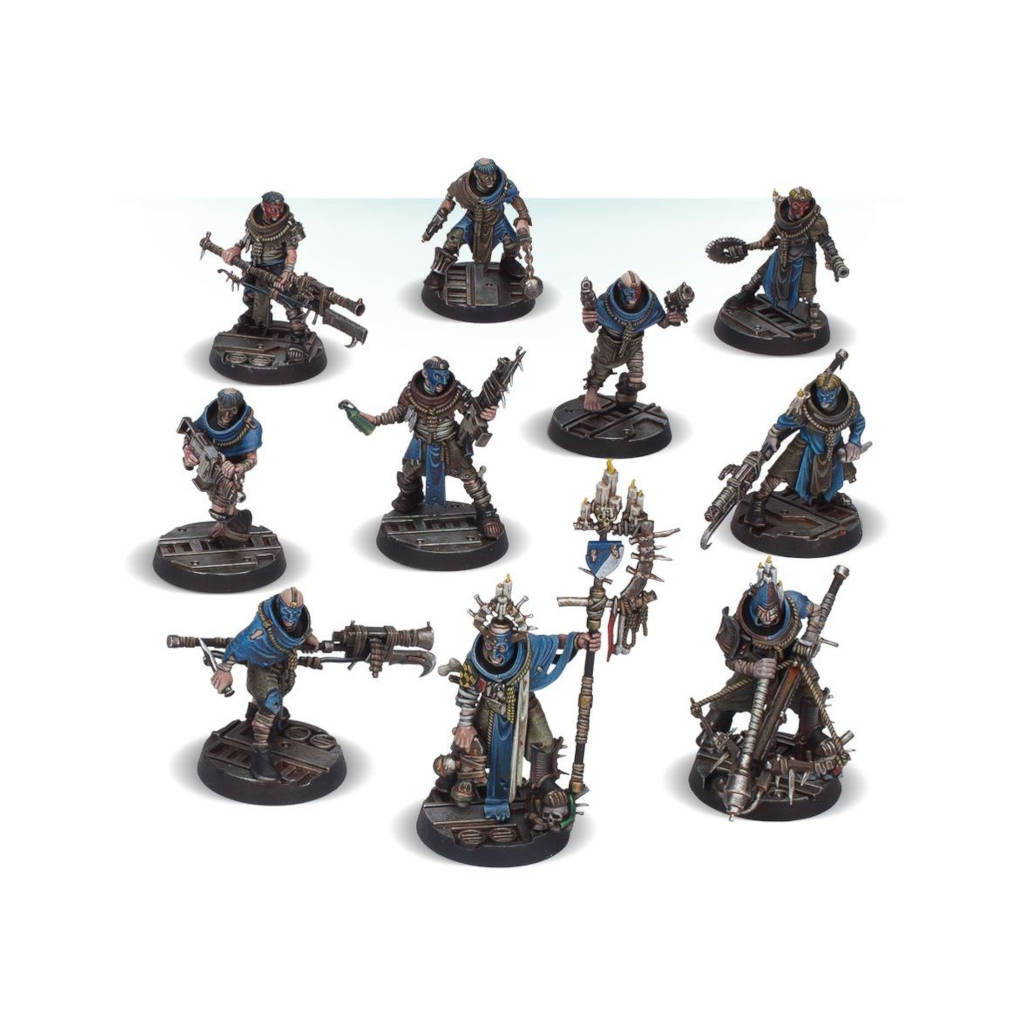- 10 corps de 5 modèles différents, soit 2 de chaque, équipés de matériel de récupération jugé digne de l'Empereur, et ornés de quantité de chandelles et de liens rituels tels que des nœuds coulants. Ces corps ont été conçus pour s'adapter préférentiellement à certaines options d'armes, mais vous êtes bien entendu libre de les monter à votre guise;- 12 têtes de 6 modèles différents, soit 2 de chaque, elles aussi avec du matériel recyclé;- Des armes à foison! 2 charges incendiaires, 2 fléaux, 4 couteaux à dépecer, 2 lames barbelées, 4 pistolets-mitrailleurs, 4 flingues, 4 fusils d'assaut, 2 icônes du culte, 2 armes d'hast (avec fusil d'assaut fixé au bout), 2 arbalètes lourdes, 2 lance-flammes légers et 2 autres armes d'hast (celles-ci avec tromblon attaché au bout).