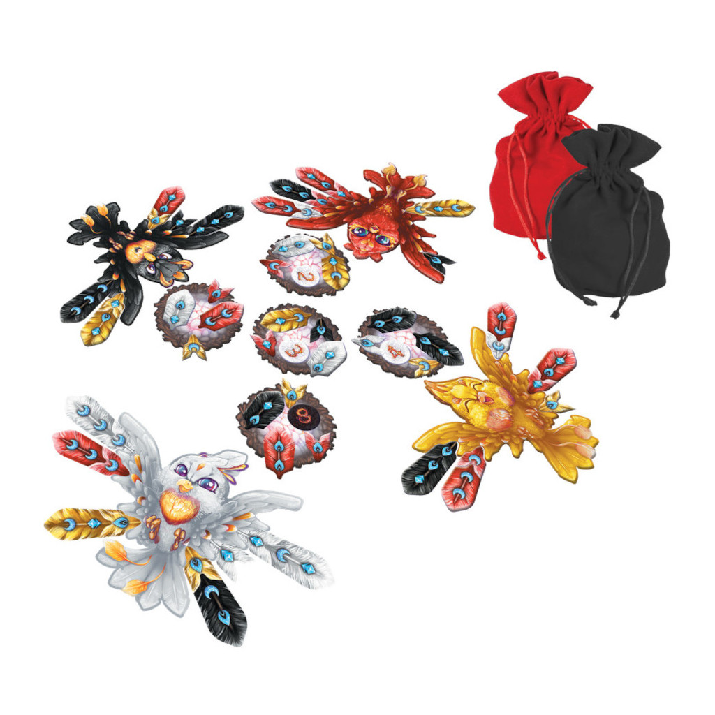 5 plateaux “nids”4 jetons “cendres”42 bas de plumes42 hauts de plumes4 plateaux “phénix”2 sacs pour contenir les plumesUn bloc note de score1 règle