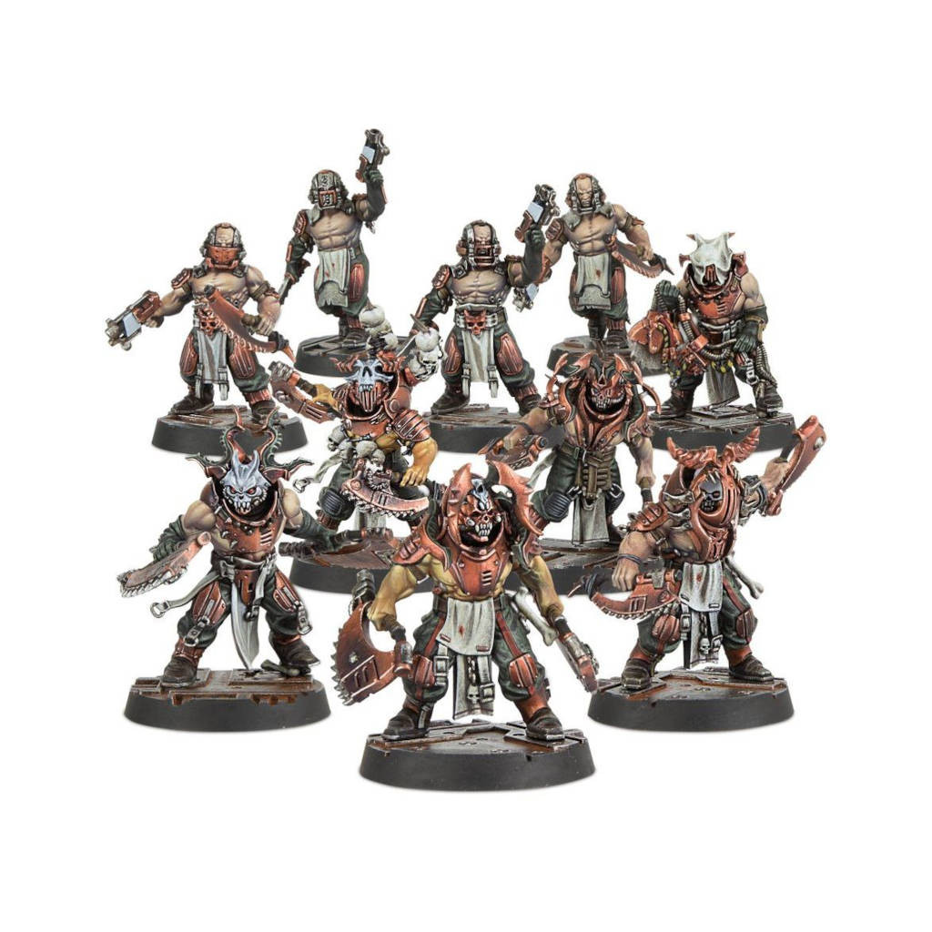 Ce kit de dix Corpse Grinder Cultists a été conçu pour vous offrir une grande variété d'options d'assemblage, afin d'éviter que vos sectes soient toutes les mêmes. Ce kit convient aussi bien à fonder une secte qu'à en renforcer une qui existe déjà. Il comprend de quoi monter 6 Skinners – dont les options pour réaliser un Butcher (Chef) et un Cutter (Champion) – et 4 Initiates. Les Butchers, Cutters et Skinners sont armés d'un brutal assortiment de hachoirs tronçonneurs et de scies circulaires à découper, tandis que les Initiates ont accès à des hachoirs tronçonneurs, épées à désosser et pistolets-mitrailleurs.