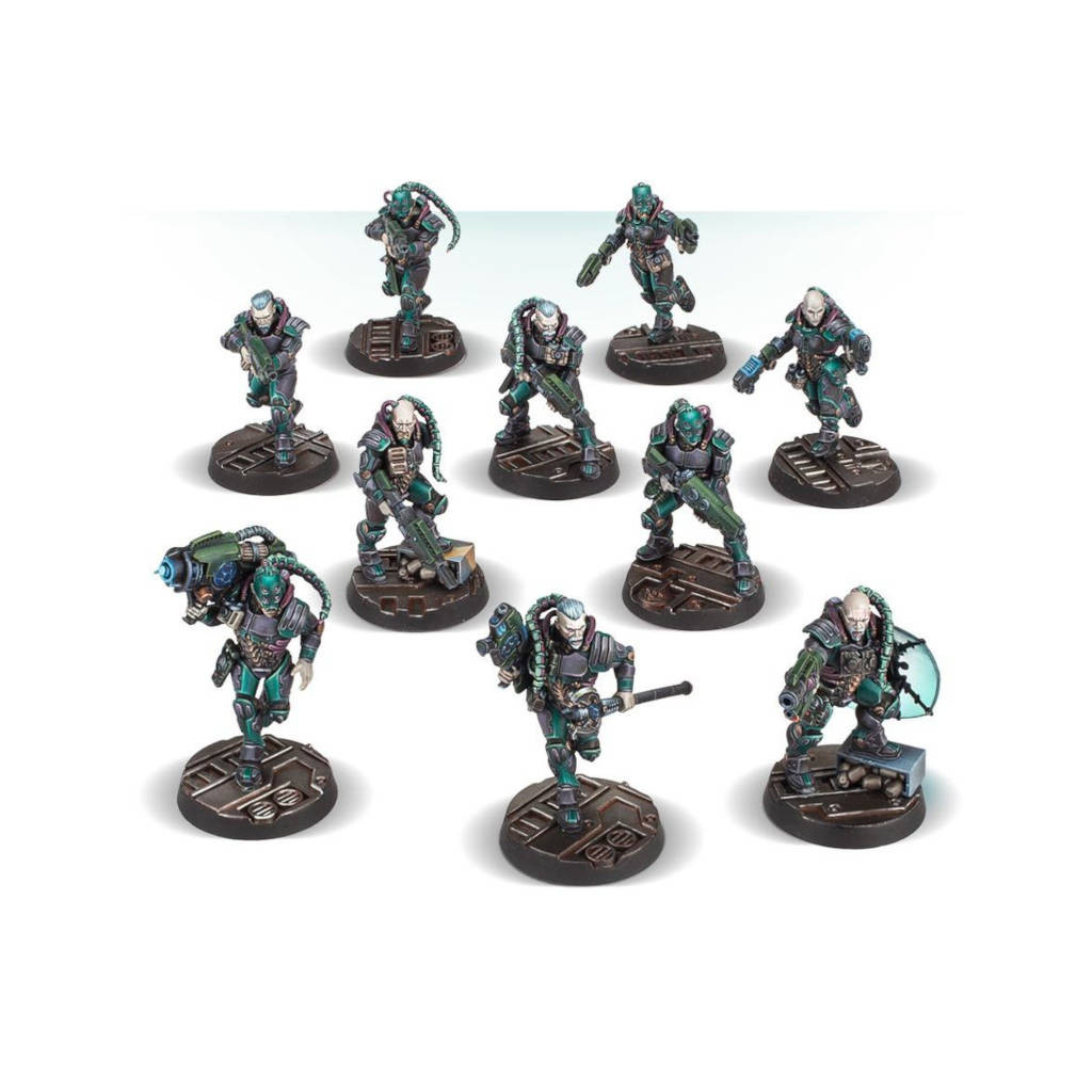 - 10 corps de 5 modèles différents, soit 2 de chaque, tous en justaucorps renforcé, et à assembler de deux manières recommandées:- Le corps 1 peut être armé d'un fusil laser et d'un couteau énergétique, ou d'un laser de suppression- Le corps 2 peut être armé d'un fusil à plasma et d'un électrosceptre, ou d'un canon à radiations;- Le corps 3 peut être armé d'une carabine laser ou d'un fusil laser- Le corps 4 peut être armé d'une arme combinée (fusil laser/fuseur) et d'un boucliers d’énergie Hystrar, ou d'un fusil laser- Le corps 5 peut être armé de 2 pistolets à plasma, ou de 2 pistolets laser;- 20 têtes – 12 nues, 8 casquées – compatibles avec tous les corps;- 10 paires d'épaulières;- Un assortiment de grenades, poches et accessoires pour ajouter du détail aux figurines.