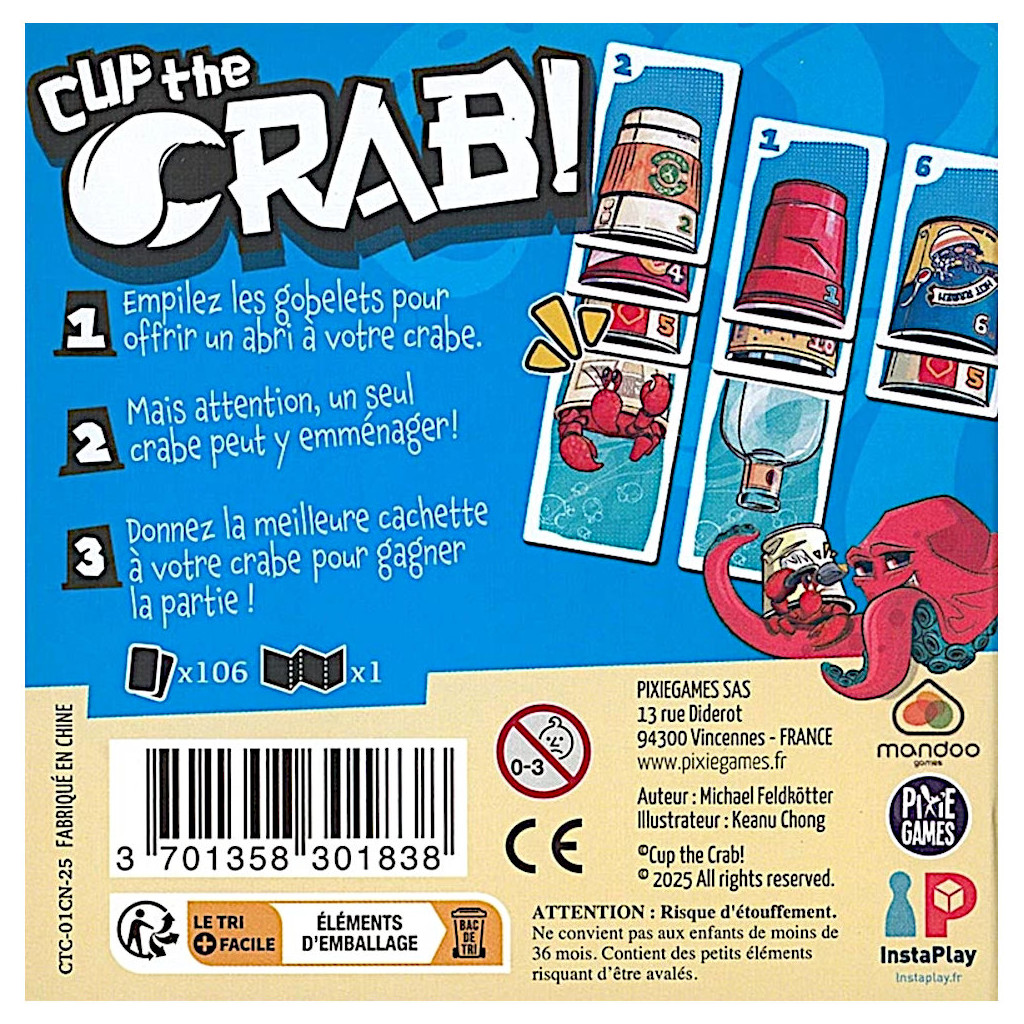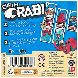 Vin d'jeu: Cup the Crab comporte une mécanique de stop ou encore car si on a décidé de prendre un crabe dans sa main, quand arrive son tour de jouer une carte, on va hésiter de ramasser une colonne de gobelets existante ou tenter d’attendre encore un peu qu’elle se remplisse tout en espérant que personne d’autre ne se serve avant soi. Cup the Crab propose également une mécanique de guessing car, au début de chaque tour, on doit essayer de deviner quelles cartes les autres ont prévu de jouer. Si on pense qu’ils ont préparé un crabe, peut-être est-il judicieux de préparer une bouteille et une pieuvre? Et si c’est eux qui avaient prévu une bouteille? Mieux vaut alors prévoir de petites cartes? Et qui va commencer le prochain tour? Moi? Alors peut être mieux vaut charger les colonnes de cartes fortes pour pouvoir mieux me servir au tour suivant? Et si par contre quelqu’un d’autre pensait comme moi et se serve sous mon nez? Voilà le type de réflexion que vous aurez en jouant à Cup the Grap qui marche assez bien en milieu familial tant les surprises peuvent être nombreuses ???? Et attention, à trop vouloir jouer au malin, on risque de se faire pincer ???? Tous nos avis sur: https://www.vindjeu.eu/
