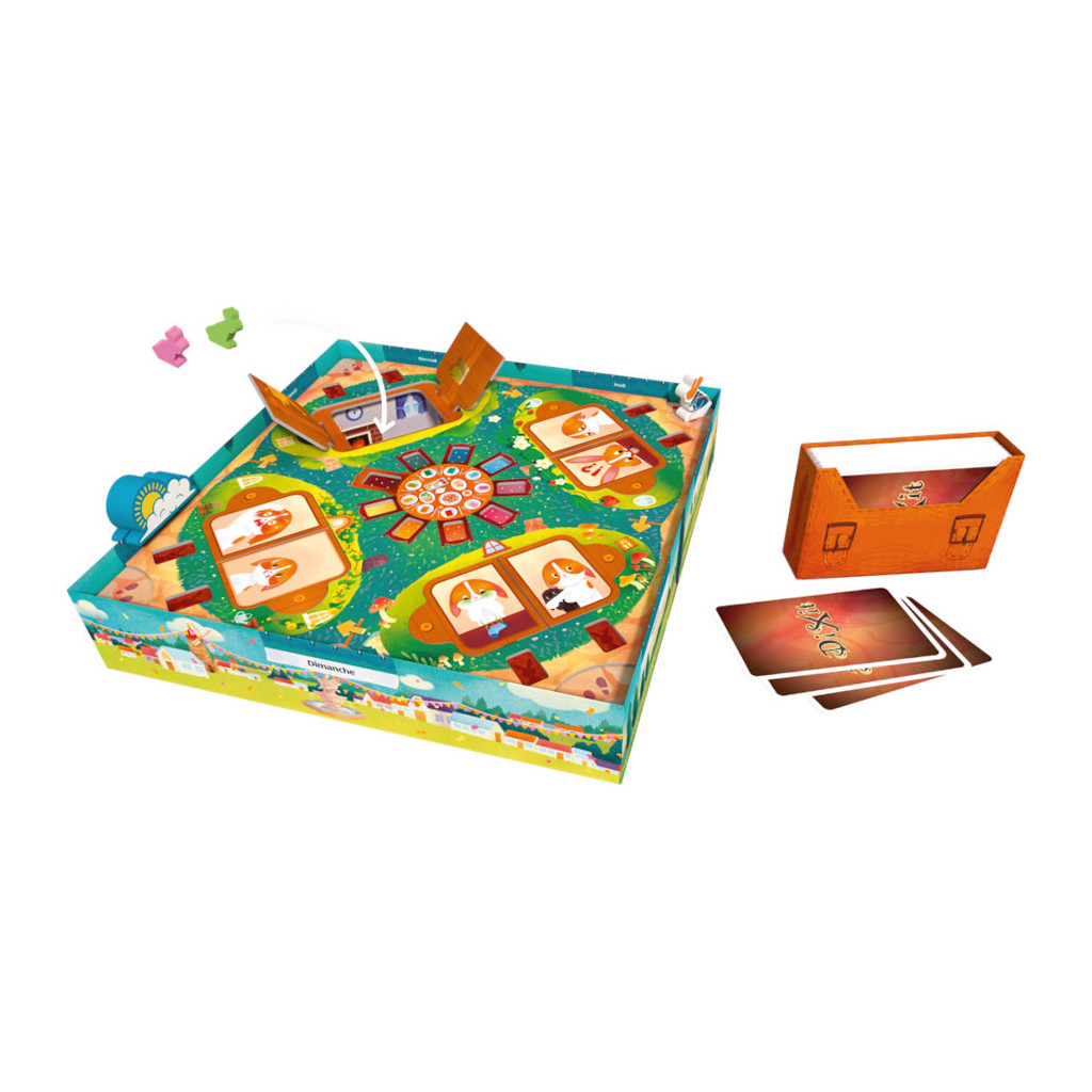 84 cartes Dixit, 8 pions Lapin en bois, 32 tuiles Porte, 1 sacoche de factrice, 1 pion Factrice en chef, 1 pion Soleil, 1 plateau de jeu.