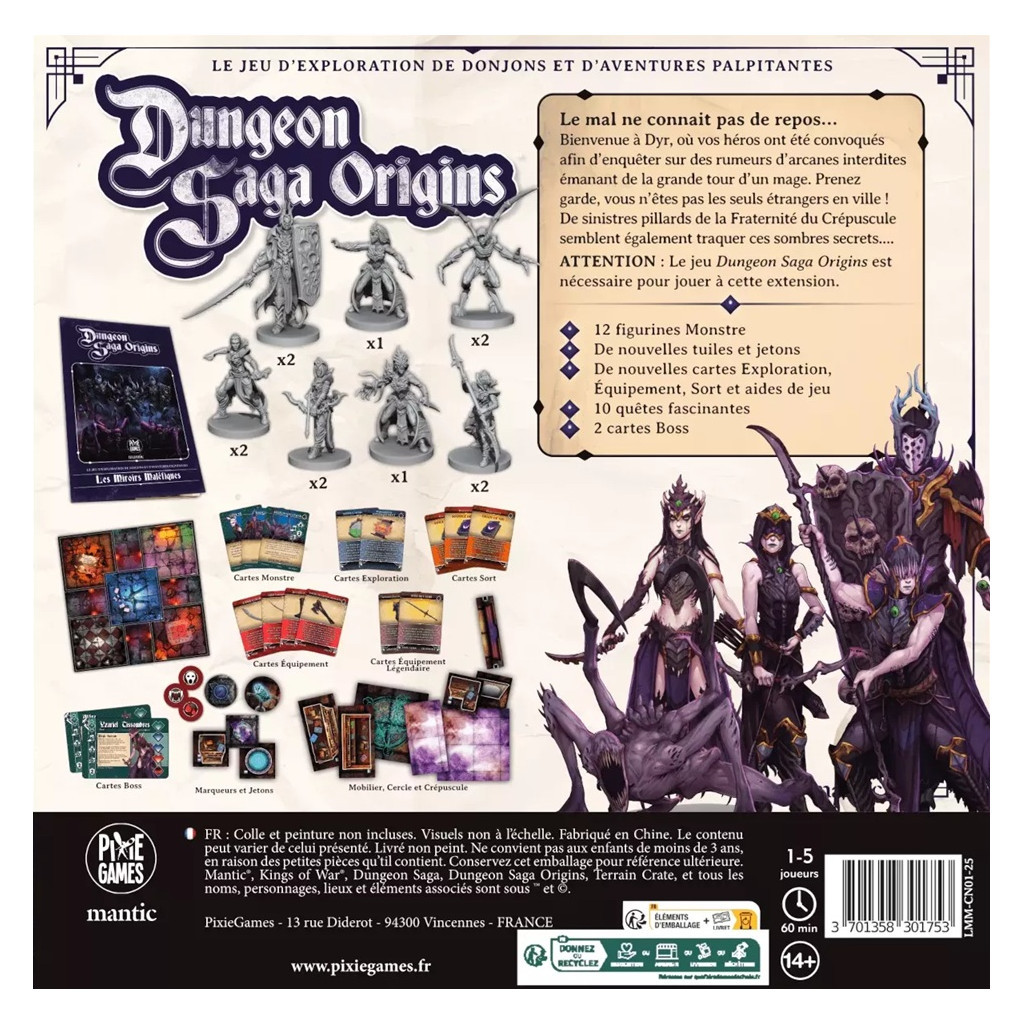 Dungeon Saga Origins Chapitre 4. Le mal ne connait pas de repos...Bienvenue à Dyr, où vos héros ont été convoqués afin d'enquêter sur des rumeurs d'arcane interdites émanant de la grande tour d'un mage. Prenez garde, vous n'êtes pas les seuls étrangers en ville !De sinistres pillards de la Fraternité du Crépuscule semblent également traquer ces sombres secrets...Les figurines sont fournies montées mais non peintes.
