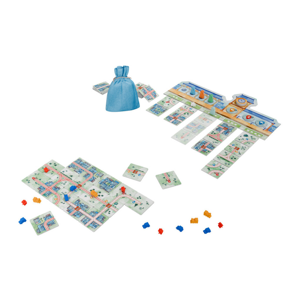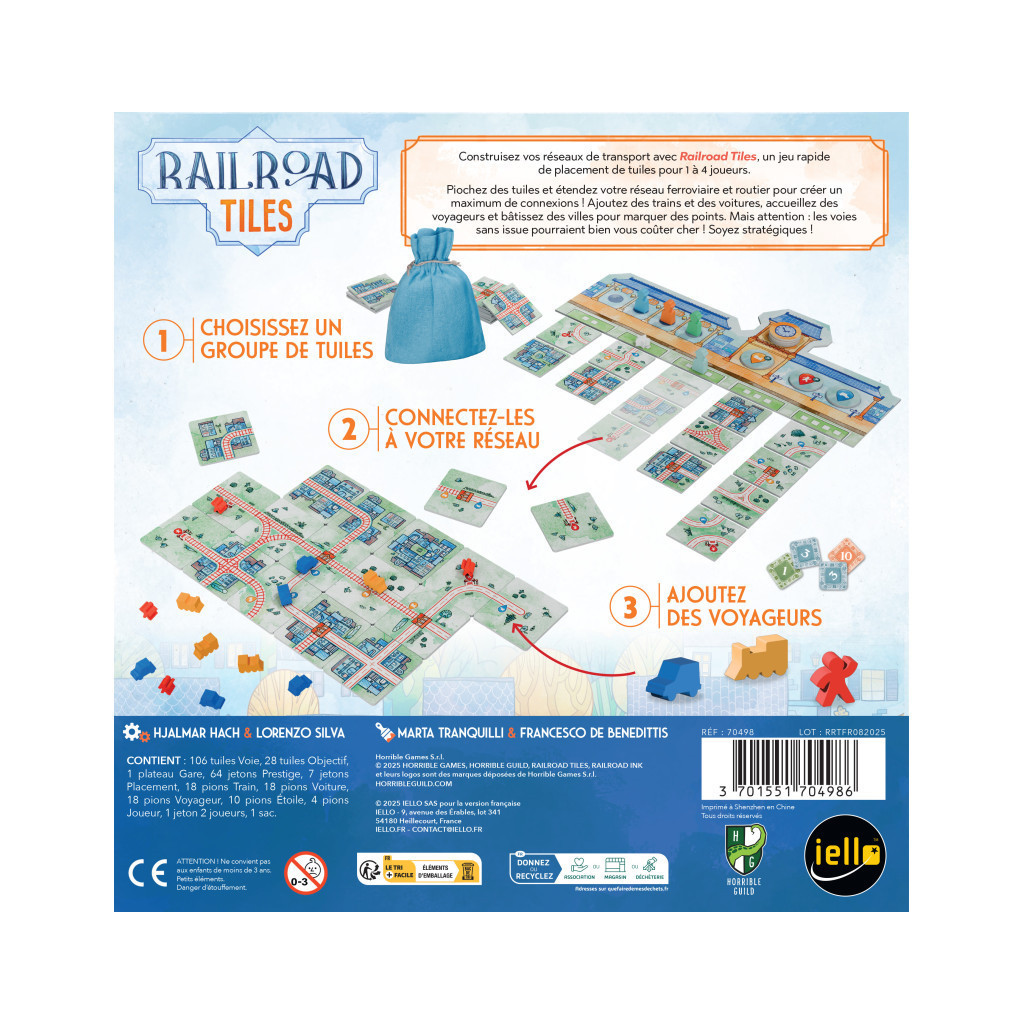 Le jeu se déroule en huit manches. Vous commencez chaque manche en choisissant vos tuiles parmi celles disponibles dans la réserve commune, puis vous placez vos itinéraires devant vous, en essayant de créer autant de connexions que possible ; veillez à ne pas vous enfermer dans des choix trop contraignants. À chaque manche, vous pouvez également placer des voitures, des trains ou des voyageurs pour peupler le petit paysage que vous créez, à condition d’avoir de la place libre sur vos tuiles. Les actions disponibles changent d’un tour à l’autre, vous devez donc vous préparer à l’avance !