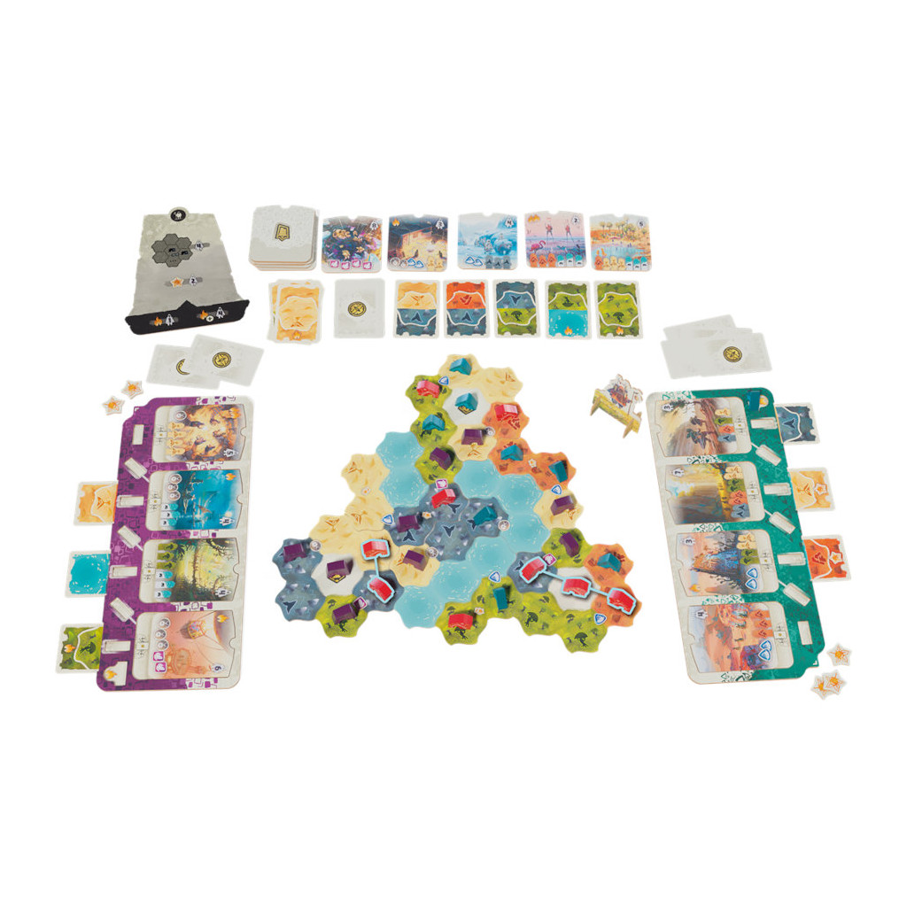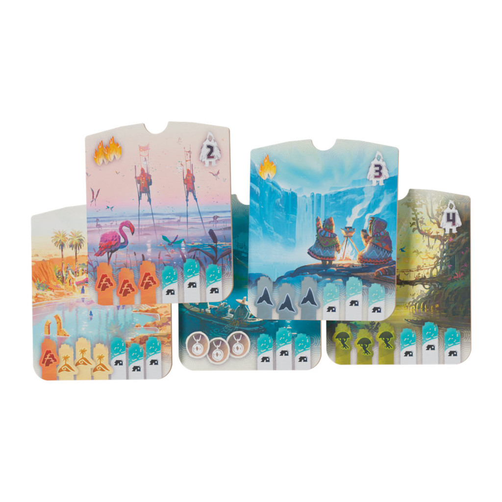 Chaque tour, vous devrez choisir entre piocher de précieuses cartes Terrain ou avancer sur la carte. Le moindre mouvement compte : vos camps bloquent, connectent ou ouvrent de nouvelles voies vers la victoire. Grâce à un système de placement malin, des objectifs à valider (tuiles Histoire) pour marquer plus de points et des effets de terrain variés, chaque décision tactique impacte votre score final. En plus de la conquête de territoires, vous devrez maîtriser le feu, récolter des baies et connecter vos camps pour maximiser votre score. Tout en mettant des batons dans les roues de vos adversaires !