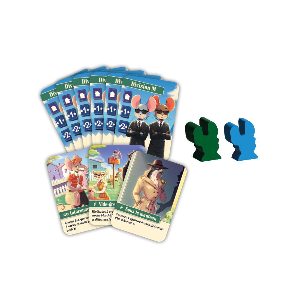 21 cartes (63x88mm) dont 6 cartes Agent et 15 cartes Marché Noir, 2 pions Division M, 1 livret de règles.