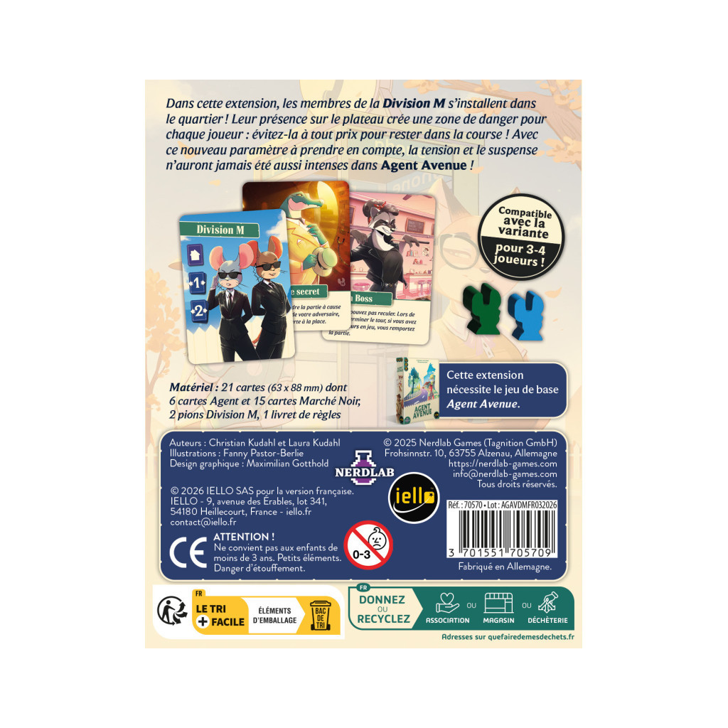 Agent Avenue – Division M est une extension passionnante, qui introduit un tout nouveau type d'agent : les souris de la Division M. Ces agents rusés créent une zone dangereuse autour de votre espace de jeu, ajoutant ainsi une nouvelle dimension stratégique, du suspense et du piquant à chaque partie d'Agent Avenue.