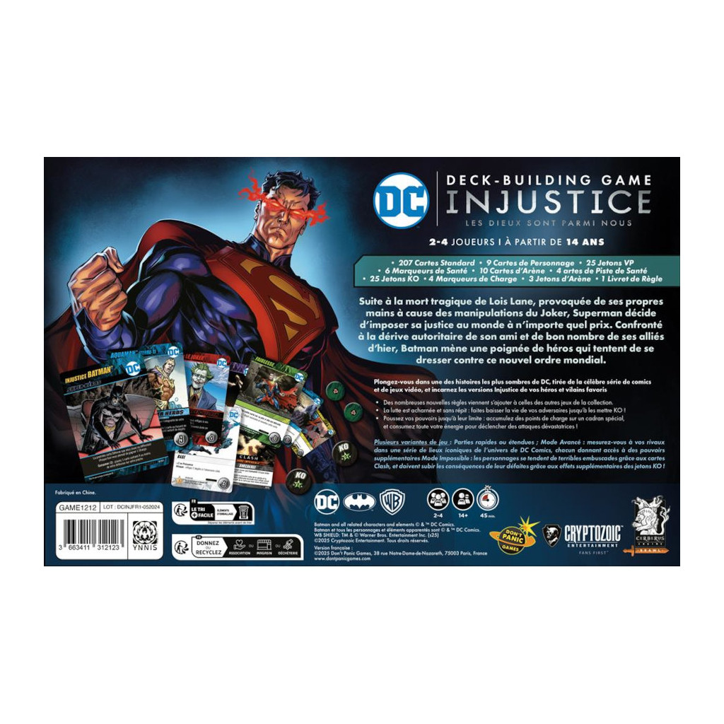 Plongez dans l’univers sombre de DC Comics Deck-Building Game : Injustice, un jeu de stratégie intense où la ligne entre le bien et le mal s’efface. Dans cet opus inspiré de la célèbre série de comics et de jeux vidéo, Superman impose un ordre mondial impitoyable après la mort de Lois Lane. Face à lui, Batman organise la résistance avec une alliance improbable de héros et de vilains.