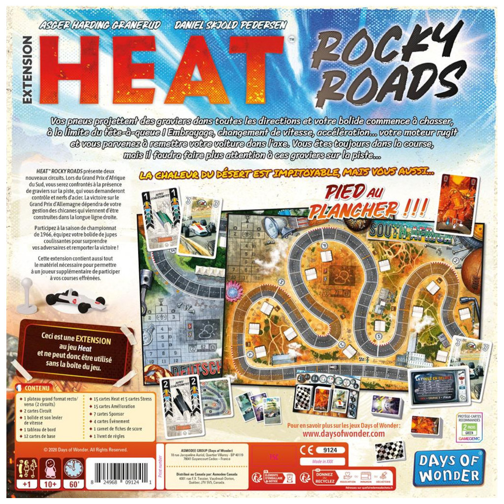 En piste avec l'extension Rocky Roads, une extension nerveuse pour les passionnés du jeu de course Heat.Le bitume vous semblait maîtrisé ? Testez les pistes de gravier et les virages serrés d’Afrique du Sud, ou encore les chicanes redoutables du circuit allemand. Chaque virage est un piège. Chaque ligne droite, une opportunité de doubler.Deux circuits inédits, mais aussi une nouvelle innovation mécanique : les jupes coulissantes, qui change votre façon d’aborder les trajectoires. Gérez votre moteur, adaptez votre stratégie, profitez de nouvelles cartes Sponsor, Stress, Upgrade ou Événement… et surtout, invitez un joueur supplémentaire à rejoindre la compétition, pour des courses toujours plus disputées.Une extension indispensable pour les fans du jeu de course le plus acclamé de ces dernières années. Nécessite la possession d’une boîte de base de Heat pour être jouée.
