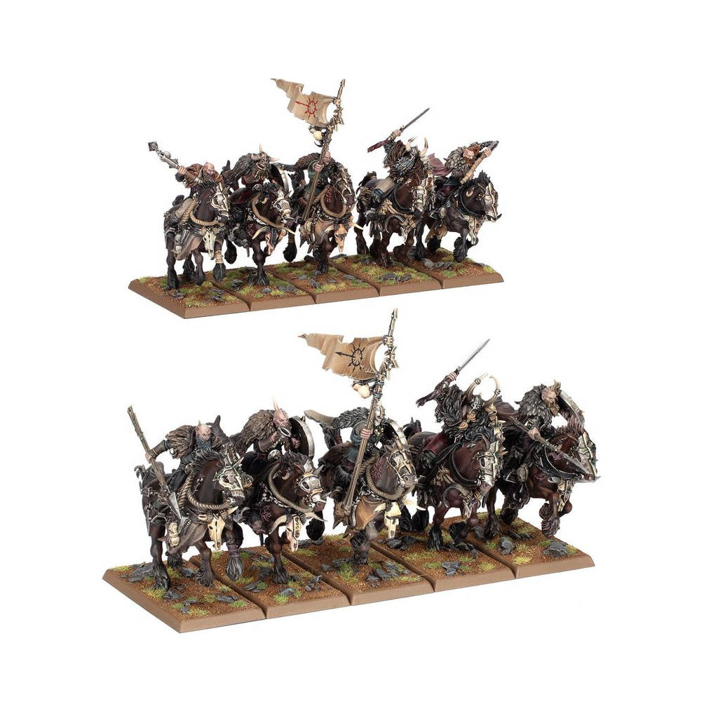 Les Cavaliers Maraudeurs chevauchent au combat de puissants destriers au tempérament destructeur. Une fois qu'un cavalier a réussi à briser la volonté d'une telle monture, elle lui demeurera loyale jusqu'à la mort. Nourris de chair humaine et de sang dilué, ces étalons écumants présentent un étincelle d'intelligence malveillante dans le regard, et se transforment en bêtes enragées une fois engagés au corps à corps.Ce kit en plastique permet d'assembler 10 Cavaliers Maraudeurs du Chaos, des cavaliers mortels et sauvages pour vos armées de Guerriers du Chaos dans les parties de Warhammer: The Old World. Ces guerriers frénétiques surgissent des désolations gelées du nord et sont prêts à déchaîner leur fureur glacée sur les ennemis des Dieux Sombres. Si vous êtes à la recherche d'une unité agile et rapide pour harceler l'ennemi sur ses flancs et achever les unités affaiblies, les Cavaliers Maraudeurs sont faits pour vous.Le contenu de cette boîte vous permet d'assembler une grande unité de 10 cavaliers, ou deux unités plus petites de 5 cavaliers, chacune dotée de ses propres champion, musicien et porte-étendard optionnels. Chaque Maraudeur peut être équipé d'une lance et d'un bouclier ou d'un fléau, et dispose d'un choix de têtes nues ou casquées.Ce kit est fourni avec 1x Planche de Décalcos des Guerriers du Chaos, proposant 246 décalcos de grande qualité pour décorer vos figurines. Cela inclut des symboles des cultes du Chien Sanglant, du Serpent Sinueux, de la Corneille Noire et du Rapace Néfaste, ainsi que d'autres symboles du Chaos et runes maudites.Ce kit est composé de 152 éléments en plastique et de 10x Socles Rectangulaires Citadel de 30mm x 60mm.