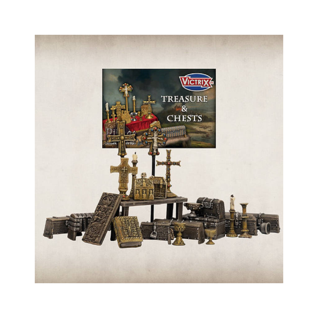 Enrichissez vos jeux d'époque médiévale et du haut Moyen Âge (y compris Pillage, bien sûr) avec cette magnifique collection de trésors et d'objets à piller. Cet ensemble comprend un assortiment de coffres, de coffrets, d'objets religieux et d'artefacts décoratifs, parfaits pour les objectifs de scénario, la mise en scène de vos parties ou le jeu narratif.