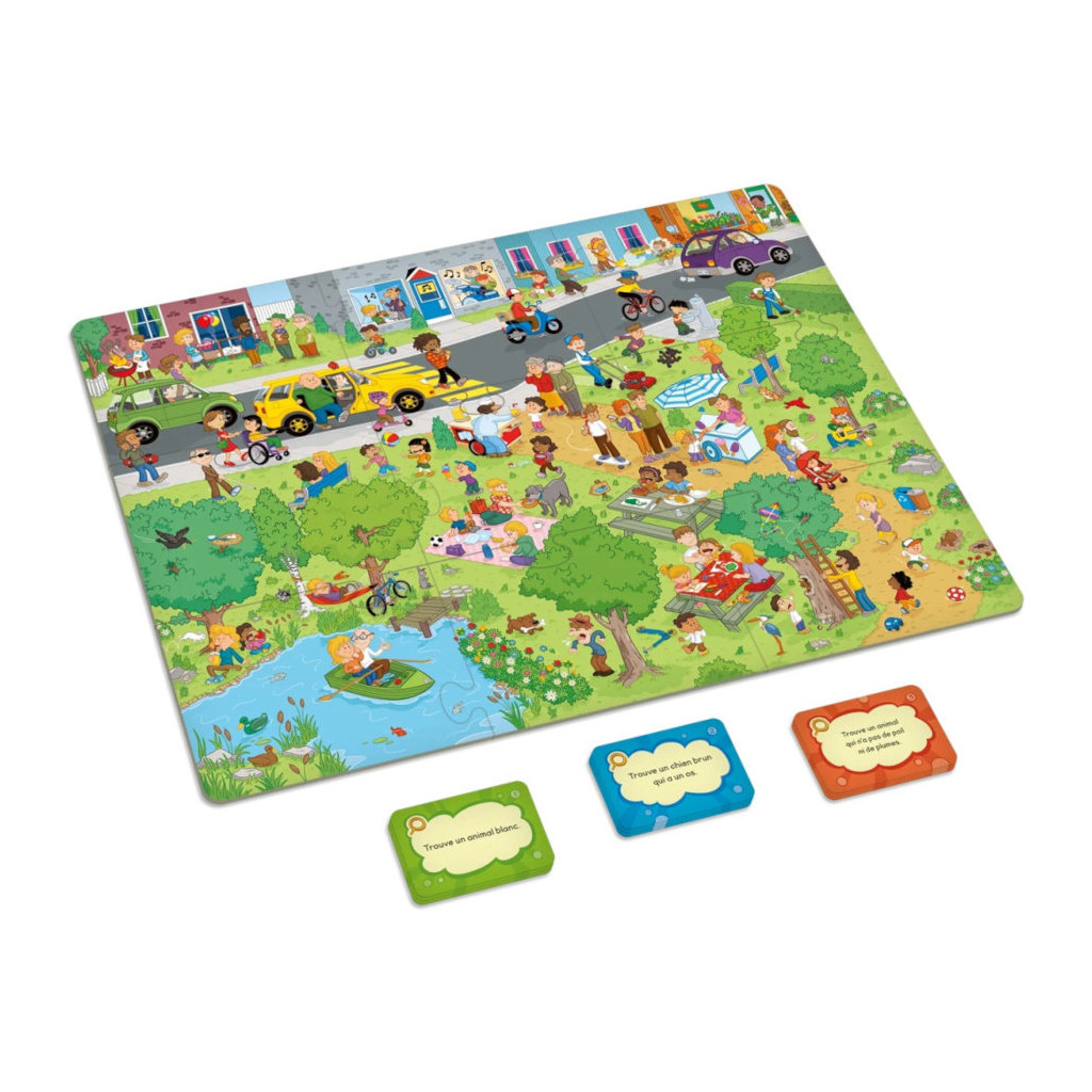Trouve un animal blanc! Trouve un objet bleu qui sert à s'assoir! Trouve un aliment jaune qui n'est pas un fruit! Écoute bien les consignes et sois le plus rapide à trouver les éléments sur la planche de jeu.
