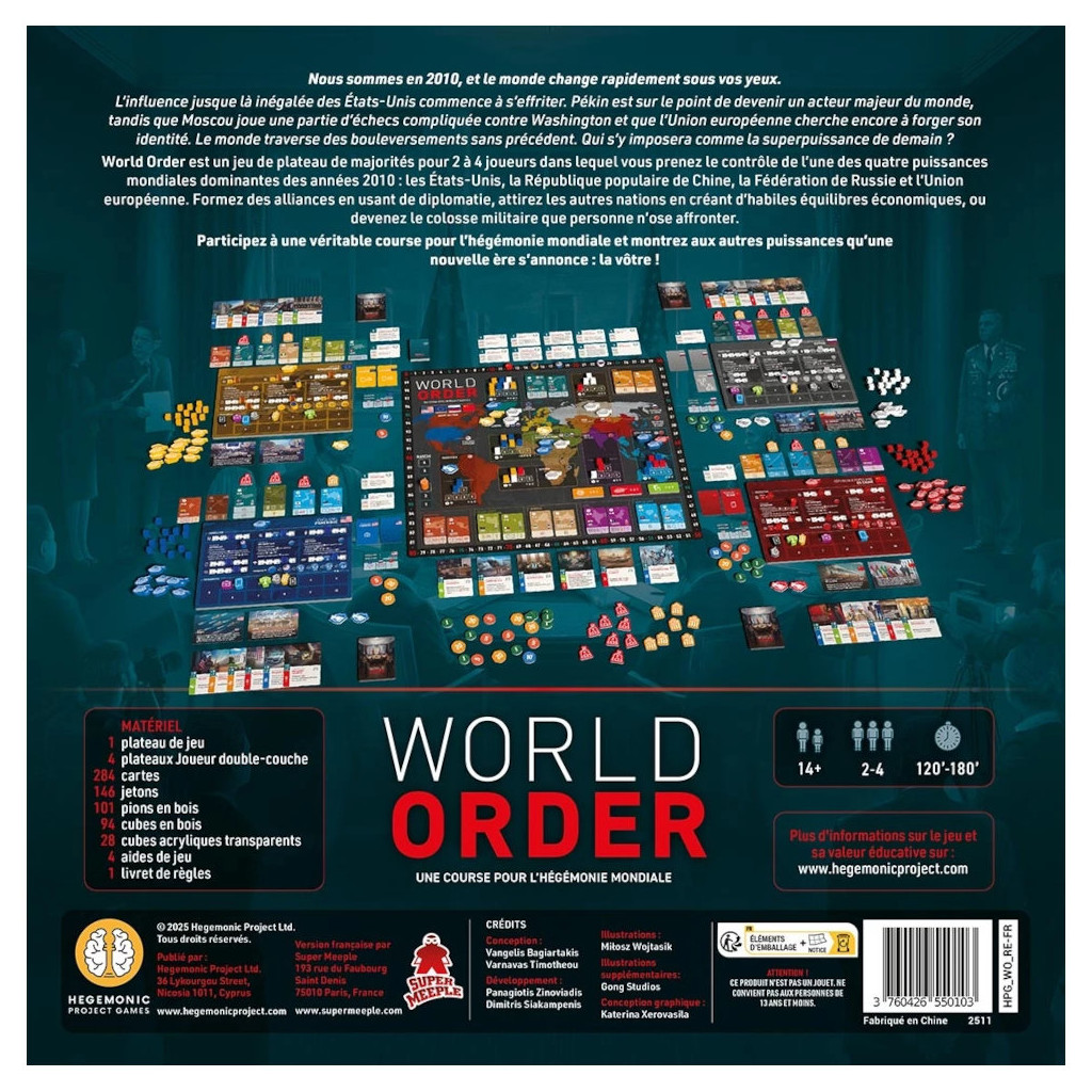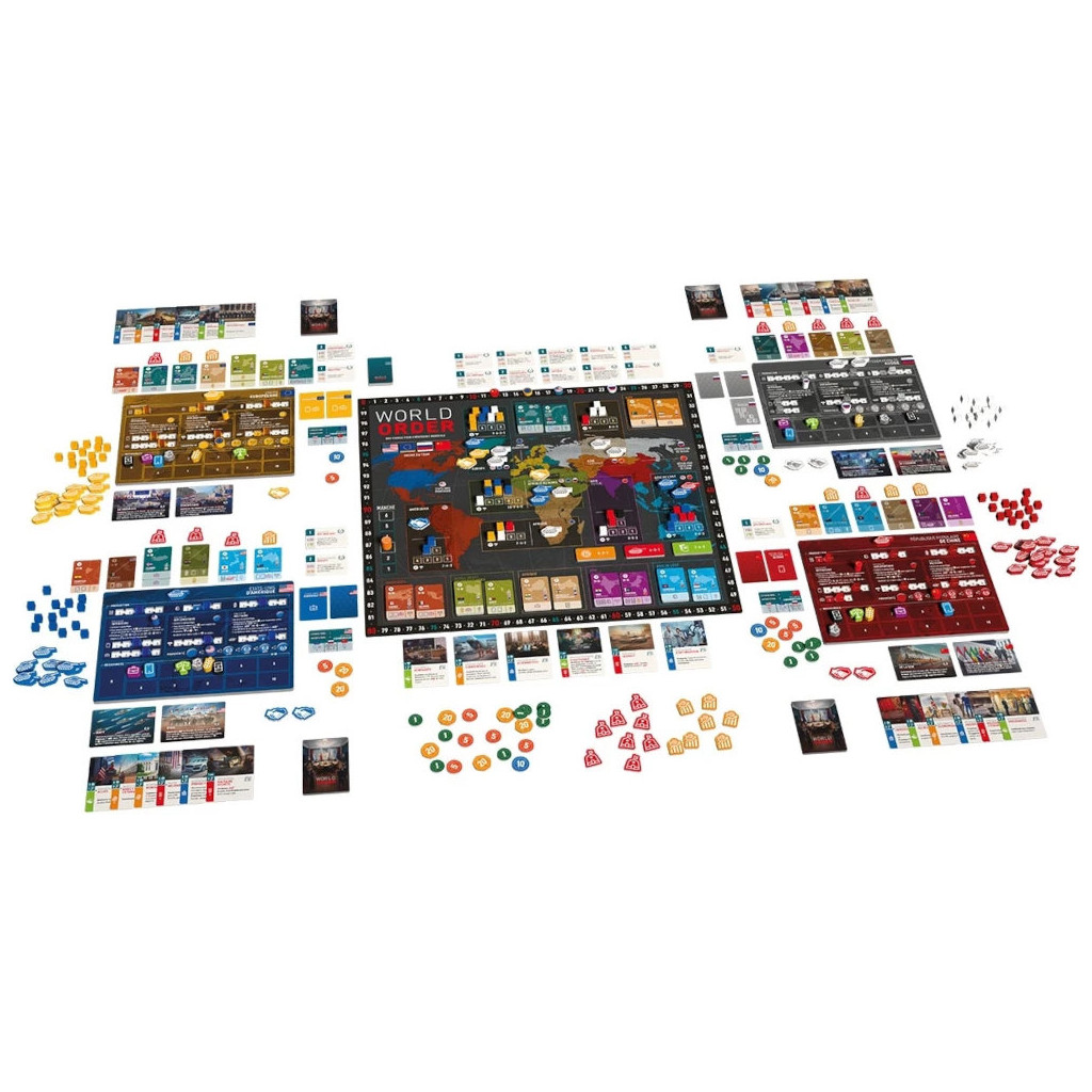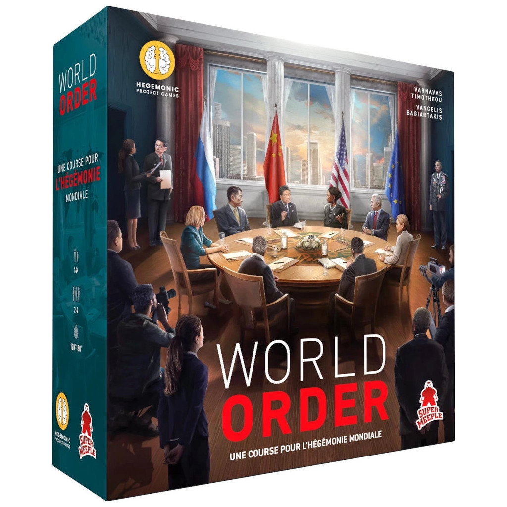 Le monde traverse des bouleversements sans précédent. Qui s’y imposera comme la superpuissance de demain ?Formez des alliances en usant de diplomatie, attirez les autres nations en créant d’habiles équilibres économiques, ou devenez le colosse militaire que personne n’ose affronter.Le monde connaît un changement radical, tandis que le pouvoir est redistribué à l'échelle mondiale, mais qui prendra la tête de cet ordre mondial en rapide évolution ?Le jeu de société World Order simule les relations internationales modernes, les joueurs prenant le contrôle de l'une des quatre puissances mondiales dominantes des années 2010 : les États-Unis d'Amérique, la République populaire de Chine, la Fédération de Russie et l'Union européenne. Utilisez votre pouvoir diplomatique, votre puissance économique et votre force militaire pour étendre votre influence à travers le monde. Formez des alliances régionales, séduisez d'autres nations grâce à des dépendances économiques astucieuses ou devenez la puissance militaire avec laquelle personne n'ose se mesurer.World Order allie des théories académiques à un gameplay passionnant, créant une expérience inédite des relations internationales ! Rejoignez le combat et montrez aux autres puissances qu'une nouvelle ère s'annonce !