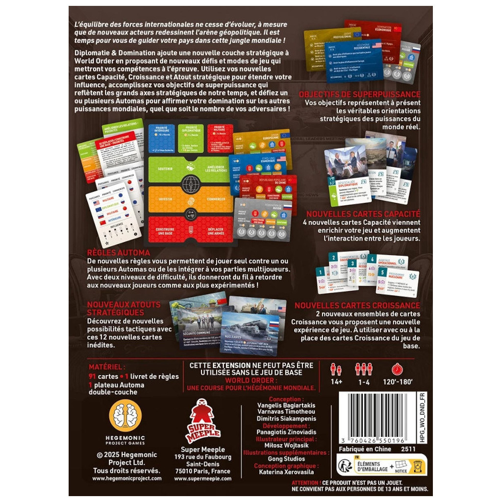 Utilisez vos nouvelles cartes Capacité, Croissance et Atout stratégique pour étendre votre influence, accomplissez vos objectifs de superpuissance qui reflètent les grands axes stratégiques de notre temps, et défiez un ou plusieurs Automas pour affirmer votre domination sur les autres puissances mondiales, quel que soit le nombre de vos adversaires !Ce jeu est une extension qui nécessite le jeu de base.