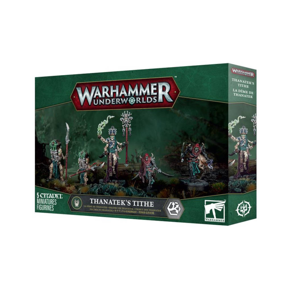 L'agent ossiarque Thanatek cherche de "l'os véritable", de la matière osseuse caractérisée par une pureté inhabituelle. Pour l'aider dans ses recherches, l'Émissaire a rassemblé une bande efficace de récolteurs de cadavres. Les assassins armés d'épées Tukhar et Sekhmor éviscèrent les proies prometteuses, tandis que les serviteurs de la caste Mornial appelés Xar-Tamok et Medeb-Ahk collectent les restes riches en os véritable et la matière spirituelle dans les coffrets qui saillent de leurs torses squelettiques.Ce kit en plastique permet d'assembler la Dîme de Thanatek, une bande complète utilisable dans les parties de Warhammer Underworlds. Il contient les cartes de combattant et les cartes de charte de la bande.La Dîme de Thanatek est une bande de type Polyvalent qui fonctionnent bien avec les piles Polyvalentes, disponibles séparément.Ce set contient 5 figurines en plastique :– 1x Thanatek– 1x Tukhar– 1x Sekhmor– 1x Xar-Tamok– 1x Medeb-AhkCe set contient également:– 5x cartes de combattant double face– 7x cartes de charte (en anglais, français, allemand, espagnol, italien, chinois et japonais)Les cartes de combattant mesurent 63mm sur 88mm, et les cartes de charte mesurent 106mm sur 145mm.Ce kit contient 20 éléments en plastique, dont 5x socles scéniques.