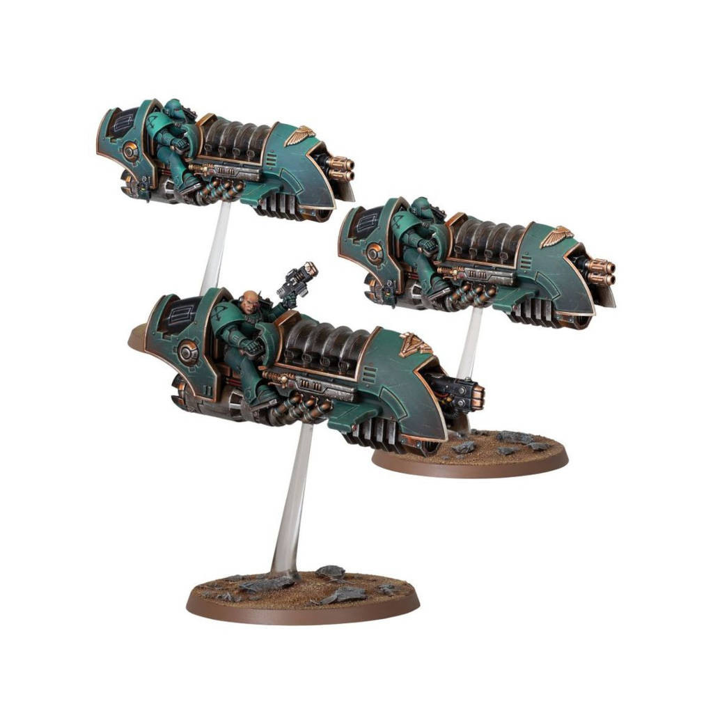 Avec la boîte Sky-Hunter Squadron pour Warhammer : The Horus Heresy, alignez l'élite des Legiones Astartes avec une escouade rapides de 3 marines à motojet.
