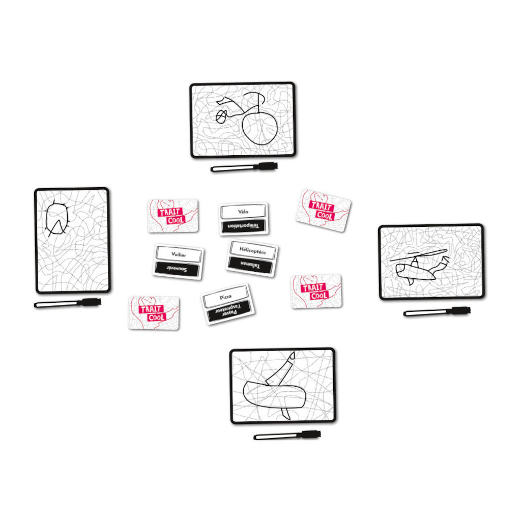 Chaque joueur pioche secrètement un mot et doit le dessiner sur son ardoise… mais uniquement en suivant les lignes pointillées déjà présentes. Ces contraintes transforment chaque croquis en casse-tête graphique !