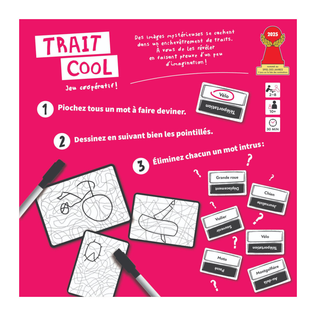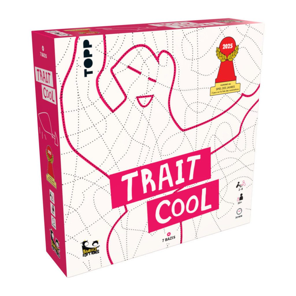 Trait Cool propose une expérience créative et coopérative unique : chaque joueur tente de faire deviner un mot en ne dessinant qu’à travers un réseau de traits déjà tracés.
