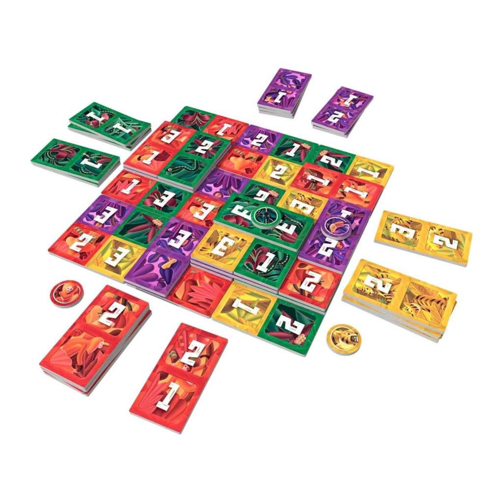 40 dominos, 9 tuiles plateau, 4 jetons totem et 1 livret de règles. Matériel double face.