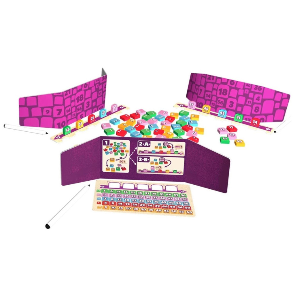 - 60 tuiles colorées- 4 supports- 4 fiches de jeu- 4 paravents- 4 feutres à encre effaçables- 1 règle de jeu