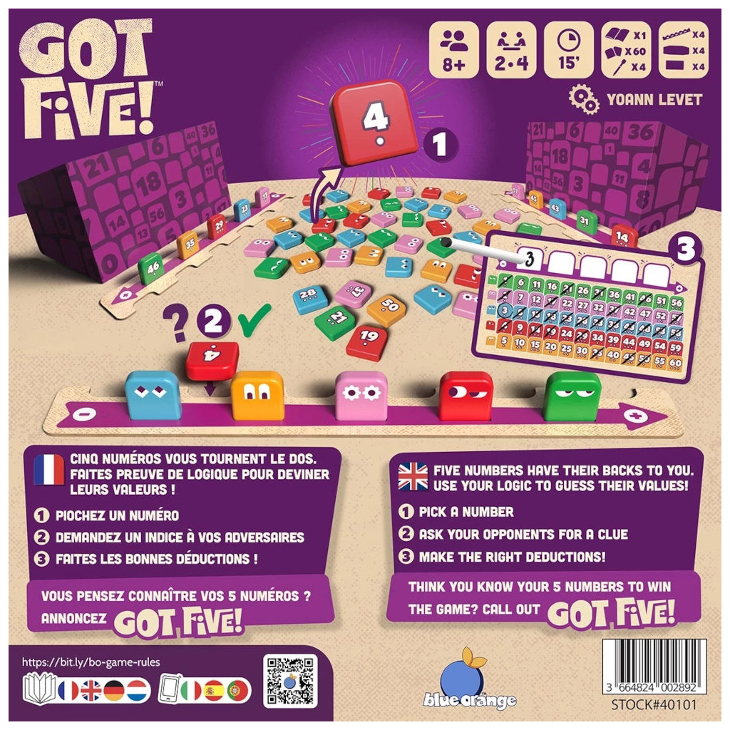 Got Five est un jeu de logique et de déduction créé par Yoann Levet (Turing Machine). Posez les bonnes questions à vos adversaires pour découvrir vos 5 numéros secrets avant tout le monde !À chaque tour, révélez une tuile puis interrogez les autres joueurs : ils devront soit classer votre tuile parmi vos numéros secrets, soit la comparer selon son nombre de points. Analysez les réponses, affinez vos déductions et soyez le premier à identifier vos cinq numéros pour remporter la partie.Un jeu malin, rapide et accessible, parfait pour les amateurs de réflexion et de déduction.