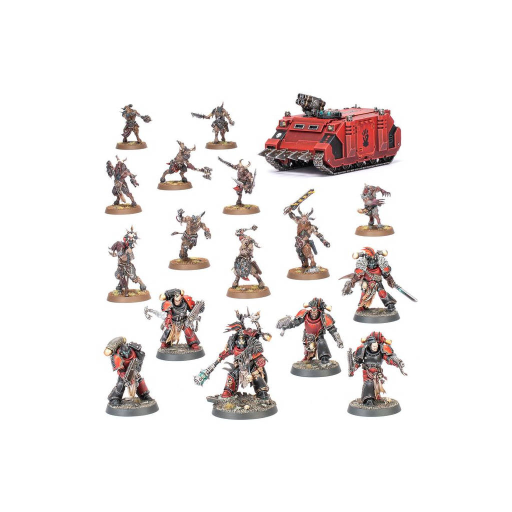 Les Red Corsairs frappent en petites bandes de cruels guerriers, pillant et saccageant, partout et chaque fois qu'ils le souhaitent. Ils vivent de ce qu'ils récupèrent des adversaires vaincus, en cherchant constamment à croître en force pour s'en prendre à de plus grandes proies. Ces Space Marines du Chaos prennent souvent à leur service des cultistes mortels et des hommes-bêtes afin de gonfler leur nombre et de s'occuper des ennemis les plus faibles.Cette boîte bien fournie est le moyen parfait d'entamer une nouvelle collection de Space Marines du Chaos sur le thème des Red Corsairs ou d'agrandir une armée existante tout en faisant des économies par rapport à un achat des kits au détail. Cette force frappant fort est menée par un Capitaine-écumeur Red Corsair, un seigneur de guerre brutal et cruel équipé pour le corps à corps. Le noyau de cette force se compose de Pillards Red Corsairs en armures énergétiques et d'une unité de sauvages Ravageurs Affregors. Un Rhino du Chaos soutient l'ensemble, en amenant dans une relative sécurité vos unités là où elles ont besoin d'être. Ces figurines représentent une force complète des Space Marines du Chaos à utiliser dans les parties de Patrouille, un format réduit et tactique de Warhammer 40,000. Les règles de cette Patrouille sont disponibles en téléchargement gratuit sur le site Warhammer Community. Cette boîte n'est disponible que dans la limite des stocks.Ce set permet d'assembler 17 figurines en plastique des Space Marines du Chaos :– 1 Capitaine-écumeur Red Corsair– 1 Rhino du Chaos– 5 Pillards Red Corsairs– 10 Ravageurs AffregorsLes figurines de cette boîte sont faciles à personnaliser. Le Capitaine-écumeur Red Corsair peut être équipé d'une masse énergétique ou d'une épée énergétique, et tenir de l'autre main un pistolet à plasma ou un trophée récupéré. Il dispose d'un choix de trois têtes, deux bandoulières et deux hauts de paquetage.Le Rhino du Chaos s'accompagne de toute une variété optionnelle d'icônes du Chaos, de râteliers à trophées, de chaînes, de crochets, de pointes de proue, de plaques de blindage corrompues, et d'un lanceur Havoc. Son combi-bolter peut être amélioré en arme combinée, et vous pouvez y installer en option un tireur, un pilote ou une écoutille fermée.Un des Pillards Red Corsairs peut être assemblé comme un champion optionnel. Le kit inclut 14 têtes interchangeables, 16 épaulières interchangeables, et différentes armes, incluant des bolters, des pistolets bolters, et des lames d'écumeur aiguisées.Un des Ravageurs Affregors peut être assemblé comme un champion optionnel, un autre peut recevoir en option une arme à deux mains, et un autre un sceptre corrompu optionnel. D'autres options esthétiques incluent un fouet, des pattes griffues corrompues et une grenade lancée, ainsi que 15 paires de cornes interchangeables et 15 têtes interchangeables.Cette boîte inclut également 1x Planche de Décalcos des Red Corsairs, comportant 248 décalcos de grande qualité. Cela inclut un choix de décalcos pour l'infanterie et les véhicules dépeignant l'iconographie des Red Corsairs, des crânes, des décomptes de victimes, et autres symboles scélérats.Ce kit est composé de 368 éléments en plastique, de 1x Socle Rond Citadel de 40mm et de 15x Socles Ronds Citadel de 32mm.
