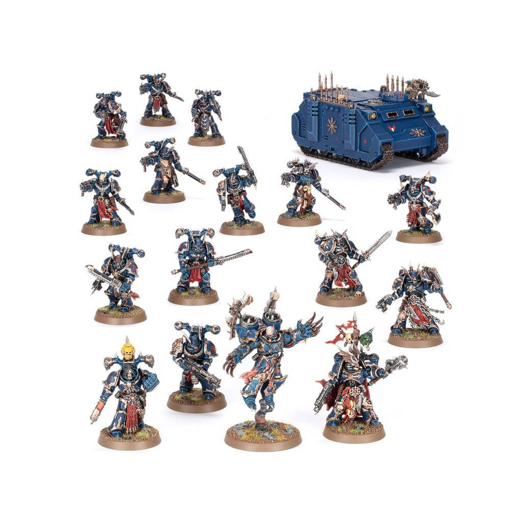 La Légion des Night Lords déploie à travers toute la galaxie des bandes réduites qui emploient la terreur pour soumettre leurs proies avant même que les lames ne soient tirées. Ce sont des guerriers cruels et impitoyables, qui disposent les cadavres de leurs victimes dans des mises en scène atroces pour glacer le sang de leurs ennemis et les mettre en déroute.Déchaînez la Terreur !Cette boîte pleine à craquer est idéale pour entamer une nouvelle collection de Space Marines du Chaos sur le thème des Night Lords ou étoffer une armée existante, à déchaîner dans les parties de Warhammer 40,000 tout en faisant des économies par rapport à un achat des kits au détail. Cette force est menée depuis l'avant par un Seigneur du Chaos avec Réacteur Dorsal, un expert du corps à corps avide d'en découdre. L'ossature de la force est composée de Légionnaires, des troupes de ligne polyvalentes tout aussi capables de s'emparer des objectifs clés que de libérer des salves dévastatrices. Une unité d'Élus vient apporter le renfort de ses millénaires d'expérience ainsi que de ses terribles armes de corps à corps. Le Rhino du Chaos vous permettra de transporter l'une de vos unités là où elle le désire de façon relativement sécurisée et apporte un surplus de mobilité à cette force. Ces 17 figurines en plastique représentent une force complète de Space Marines du Chaos utilisable dans des parties réduites et tactiques au format Patrouille de Warhammer 40,000. Les règles permettant d'utiliser cette Patrouille sont disponibles en téléchargement gratuit sur le site de Warhammer Community. Cette boîte n'est disponible que dans la limite des stocks.Cette boîte permet d'assembler 17 figurines en plastique des Space Marines du Chaos :– 1x Seigneur du Chaos avec Réacteur Dorsal– 1x Rhino du Chaos– 5x Élus– 10x LégionnairesLes figurines de cette boîte sont faciles à personnaliser. Le Seigneur du Chaos avec Réacteur Dorsal peut être armé d'un pistolet bolter ou d'un pistolet à plasma, et d'un gantelet énergétique ou d'une hache énergétique, ou encore d'une paire de griffes Lightning. Il dispose aussi d'un choix de tête nue ou casquée.Le Rhino du Chaos est fourni avec diverses options décoratives, comme des icônes du Chaos, des râteliers de trophées, des chaînes, des crochets, des pointes de proue, des plaques de blindage corrompues et un lance-missiles Havoc. Son combi-bolter peut être amélioré en arme combinée, et il y a des options pour assembler un artilleur, un pilote ou une écoutille fermée.Le Champion Élu peut être armé d'une épée tronçonneuse, d'une hache énergétique ou d'une masse énergétique, et il dispose d'un choix de deux plaques pectorales, de deux tabards, de trois têtes et de trois sommets de paquetage dorsal. Le reste de l'escouade peut être équipé d'armes interchangeables, dont deux bolters, deux pistolets bolters, deux pistolets à plasma, deux armes combinées, deux épées tronçonneuses, des haches tronçonneuses, un gantelet énergétique et une paire de griffes Lightning. Ces guerriers disposent également de 4 paquetages dorsaux, 8 épaulières et 12 têtes, tous interchangeables.L'Aspirant Champion des Légionnaires peut être armé d'un pistolet bolter ou d'un pistolet à plasma, et d'un gantelet énergétique, d'une épée tronçonneuses, d'une masse énergétique ou d'une hache énergétique. Le reste de l'escouade peut être équipé d'armes interchangeables, dont huit bolters, huit pistolets bolters, neuf épées tronçonneuses, un fuseur, un fusil à plasma, un lance-flammes, un lance-missiles, un bolter lourd, une lame empoisonnée, un vouge tronçonneur, des griffes Lightning et une bannière dévoyée. Ces guerriers disposent également de 13 têtes et 12 épaulières, toutes interchangeables.Le kit des Légionnaires inclut également une grappe d'améliorations, qui contient des têtes et des épaulières pouvant être utilisées avec les Légionnaires, le Seigneur du Chaos avec Réacteur Dorsal et les Élus, pour leur donner une apparence plus sinistre et plus digne des Night Lords.La boîte contient également 1x Planche de Décalcos des Space Marines du Chaos, proposant 364 décalcos de grande qualité pour décorer vos figurines, dont des symboles pour la Black Legion, l'Alpha Legion, les Thousand Sons, les Iron Warriors, les Word Bearers et les Night Lords, ainsi que de nombreux autres symboles maudits.Ce kit est composé de 438 éléments en plastique, de 1x Socle Rond Citadel de 40mm et de 15x Socles Ronds Citadel de 32mm.