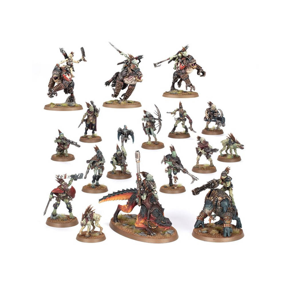 Les Kroots ont juré allégeance à l'Empire T'au, mais ils constituent souvent leurs propres groupes de chasse qui s'aventurent loin en avant des forces principales. Ils manient des armes uniques à leur culture, combinant leurs tactiques de prédilection avec la technologie avancée de leurs alliés T'au, et offrant à ces derniers un contingent de spécialistes du corps à corps. "Kroot" est un terme général désignant toute une variété de créatures, du Krootox puissamment bâti aux agiles Chiens Kroots.Préparez-vous Pour la Chasse!Cette boîte pleine à craquer est idéale pour entamer une nouvelle collection de l'Empire T'au sur le thème des Kroots ou pour étoffer une armée existante, à déchaîner dans les parties de Warhammer 40,000 tout en faisant des économies par rapport à un achat des kits au détail. Cette force est menée depuis l'avant par un Solilance Kroot juché sur le dos de sa puissante Kalamandra. Dans son sillage, c'est une bande de Saccageurs Krootox qui s'élance à la charge, une unité d'élite parfaite pour briser les lignes ennemies au corps à corps. Le noyau de la force est composé d'une Parenté d'Exorôdeurs, des chasseurs létaux et polyvalents capables de s'emparer des objectifs vitaux. L'ensemble est soutenu par un Cavalier Krootox équipé d'une arme lourde. Ces 17 figurines en plastique représentent une force complète de l'Empire T'au utilisable dans des parties réduites et tactiques au format Patrouille de Warhammer 40,000. Les règles permettant d'utiliser cette Patrouille sont disponibles en téléchargement gratuit sur le site de Warhammer Community. Cette boîte n'est disponible que dans la limite des stocks.Cette boîte permet d'assembler 17 figurines en plastique de l'Empire T'au :– 1x Solilance Kroot– 1x Cavalier Krootox– 3x Saccageurs Krootox– 12x guerriers de Parenté d'ExorôdeursLes figurines de cette boîte sont faciles à personnaliser. Le Solilance Kroot peut être armé soit d'un immense canon long kroot pour abattre ses proies à longue distance, soit d'un javelot explosif et d'un carquois de javelots de chasse effilés pour éliminer les cibles importantes à courte portée. Le Solilance dispose d'un choix de deux têtes, et la Kalamandra d'un choix de deux têtes et de deux poses différentes.Le Cavalier Krootox peut porter au combat l'une des deux armes lourdes suivantes: canon à répétition ou canon à filet. Le Krootox et son cavalier disposent chacun d'un choix de deux têtes.La Parenté d'Exorôdeurs est un kit très polyvalent. Le Courtier de Chasse peut être armé soit d'une arme à feu d'Exorôdeur, soit d'un fusil à technologie t'au. Six des Exorôdeurs disposent d'un choix de deux armes à feu différentes, l'un d'eux peut être équipé d'une arme de corps à corps en option, un autre peut porter un Pech'ra, et un autre peut brandir un écorcheur dvorgite ou un tribaleste londaxien. Ils disposent de 13 têtes interchangeables, de 13 accessoires optionnels et les têtes des deux Chiens Kroots sont interchangeables.Ce kit est composé de 297 éléments en plastique, de 1x Socle Ovale Citadel de 90mm x 52,5mm, de 1x Socle Rond Citadel de 32mm, de 4x Socles Ronds Citadel de 50mm et de 11x Socles Ronds Citadel de 28,5mm.