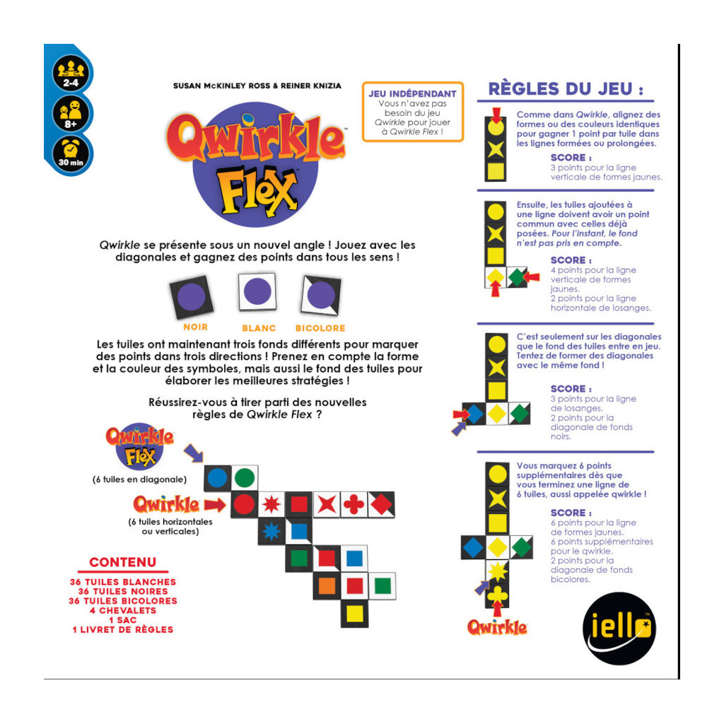 Qwirkle se présente sous un nouvel angle ! Jouez avec les diagonales et gagnez des points dans tous les sens. Les tuiles ont maintenant 3 fonds différents pour marquer des points dans trois directions ! Prenez en compte la forme et la couleur des symboles, mais aussi le fond des tuiles pour élaborer les meilleures stratégies.