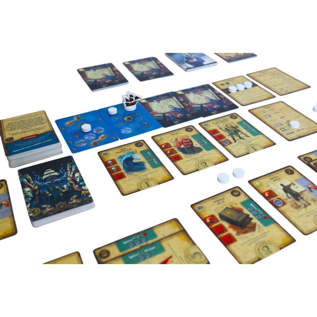 Contenu :- 15 cartes Carte Classique, - 3 cartes Destination Finale, - 40 cartes Navigation, - 45 cartes Rencontre, - 1 carte Tour de jeu, - 1 carte Coût de navigation, - 1 carte Météo, - 1 carte Événements,- 1 carte Expérience, - 12 cartes Campagne (A–H), - 4 cartes de sauvegarde, - 1 pion Bateau, - 30 jetons multifonctions, - 1 fiche d’améliorations Campagne.
