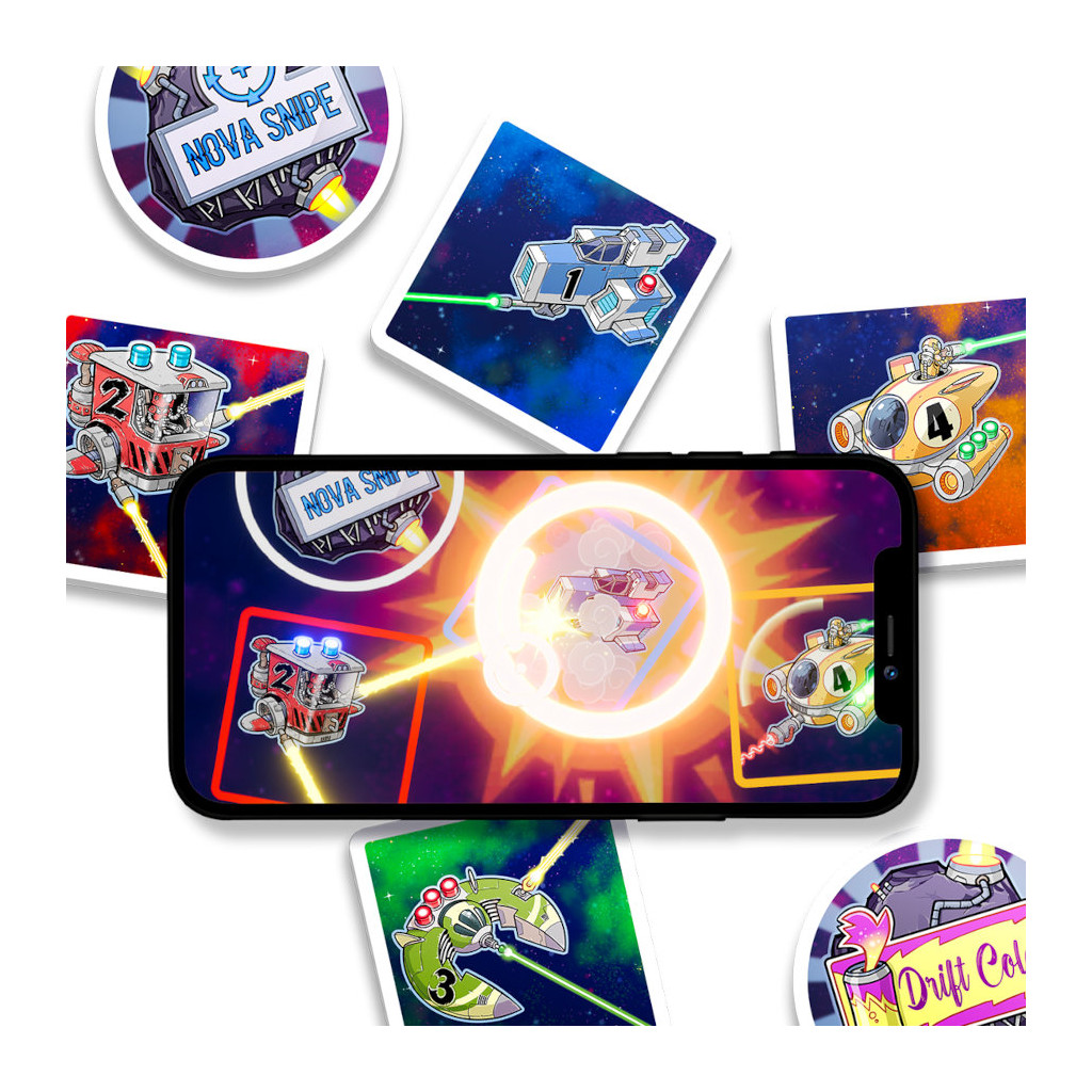 Alors que le rugissement de la foule résonne, l'arène s'illumine de la lueur brillante des publicités des sponsors : Choisissez votre faction et lancez-vous dans la bataille. Placez et orientez tactiquement vos vaisseaux spatiaux pour marquer le plus de points en détruisant les véhicules ennemis, en collectant les unités minérales des astéroïdes et en impressionnant les sponsors du jeu. Avec une seule photo prise à la fin du jeu, l'application compagnon résoudra et visualisera la bataille pour vous.