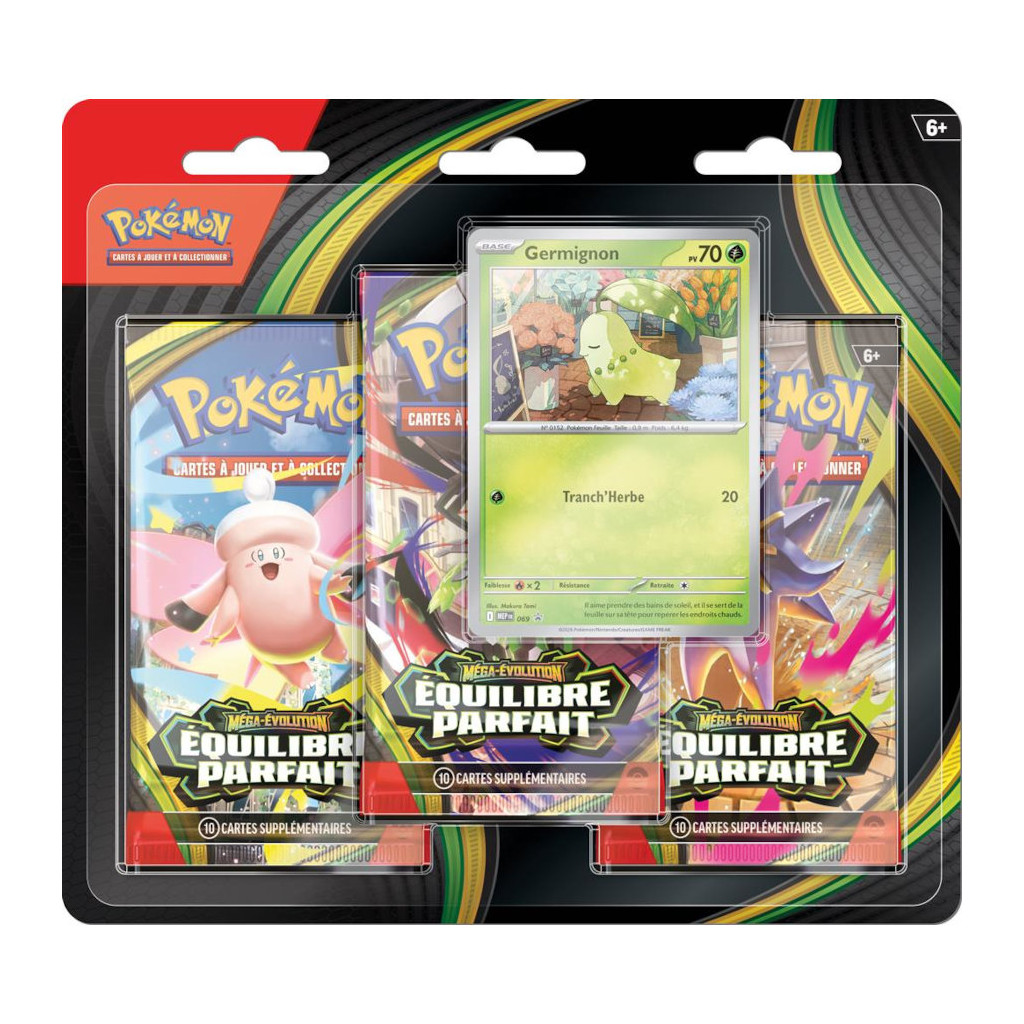 Pack contenant 3 Boosters Pokémon VF de la série ME03 : Equilibre Parfait, ainsi qu'une carte promo de Germignon.
