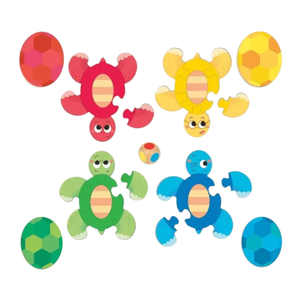 Découvrez ce jeu de société aux règles simples. Chaque joueur choisit une tortue qu'il va compléter : tête, pattes, carapace. À tour de rôle, les enfants lancent le dé en bois, et selon la couleur, complètent leur tortue.