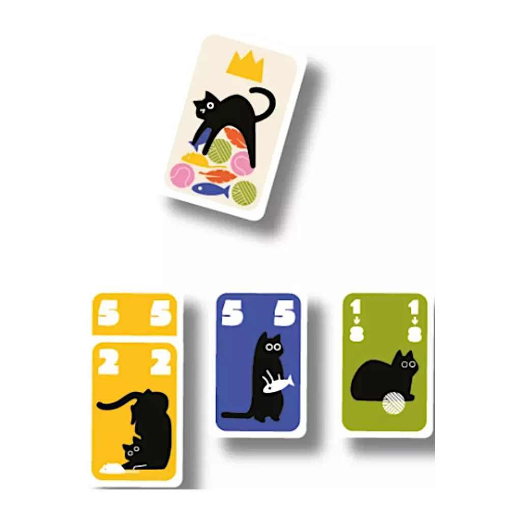 Le but du jeu est de récupérer les 5 couleurs de jouets. Mais attention, si vous avez 4 cartes ou plus du même jouet, vous devrez les distribuer aux autres joueurs ! Jouez astucieusement vos cartes, utilisez les cartes Coup de patte et les atouts au bon moment et vous remporterez une carte Super chat !