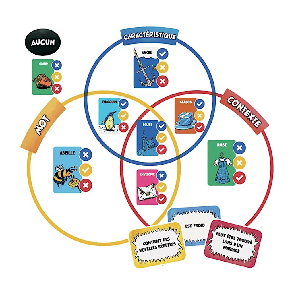 Le but du jeu est de se débarrasser de toutes ses cartes. Saurez-vous deviner la logique des anneaux avant vos adversaires ? N’oubliez pas : vous pouvez jouer dans les zones de chevauchement du diagramme de Venn, ou même en dehors des cercles !