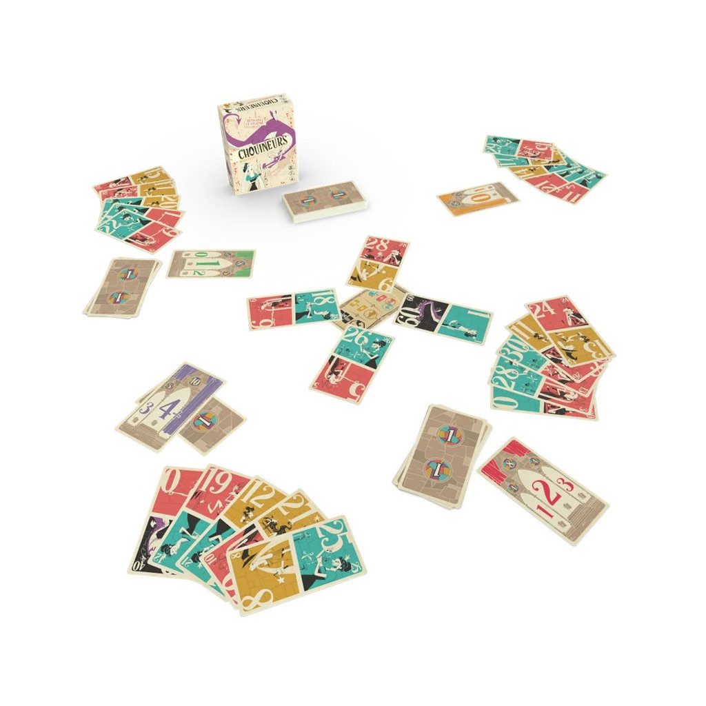Chouineurs est un jeu de plis. Au début de chacune des quatre manches, vous pariez sur le nombre de plis que vous pensez remporter. Plus vous vous approchez de votre pari, plus vous marquez de points. Mais si les choses ne se déroulent pas comme prévu ? Alors, chouinez un coup ! Et adaptez vous !