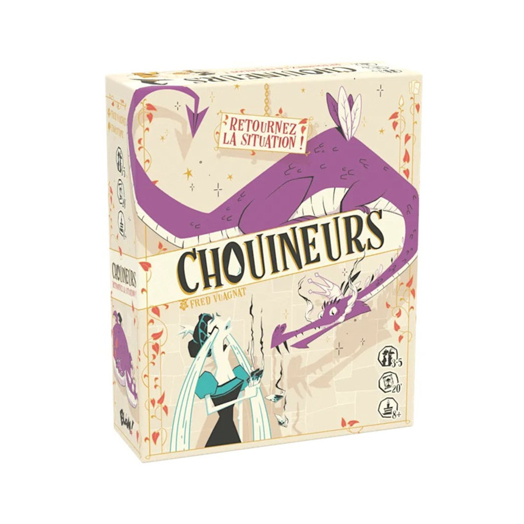 Chouineurs est un jeu de plis. Classiquement, vous devrez "suivre", mais vous pourrez aussi "couper", "pisser", et même "chouiner" !Au début de chaque manche, vous devez choisir dans quel sens jouer les cartes de votre main. Dépendant de ce choix, vous pariez sur le nombre de plis que vous pensez remporter lors de la manche.Lors d'un pli, la couleur doit être suivie si possible. Sinon vous pouvez "couper", ou "pisser". Vous avez aussi la possibilité de "super-couper", même si vous avez la couleur demandée.Enfin et surtout, si vous jouez la carte de plus petite valeur du pli, vous "chouinez" et pouvez alors gagner un point ou retourner une carte de votre main, et adapter ainsi votre jeu !Après sept plis, la manche est finie. Chacun gagne des points s'il a réussi son pari ou s'il a "chouiné" durant la manche.Au terme de la quatrième manche, le joueur avec le plus haut score l'emporte.