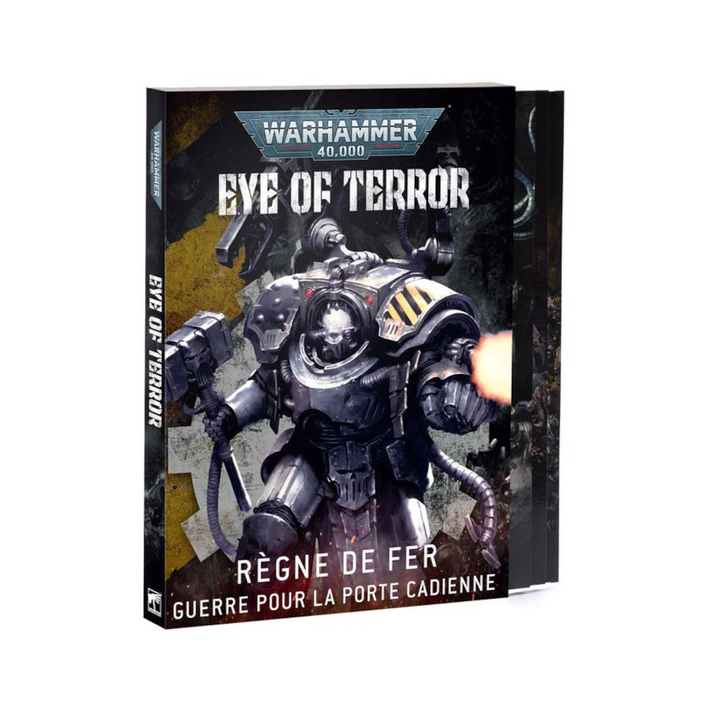 Légions Renégates, traîtres et démons ravagent les mondes de la Porte Cadienne, menant tous leurs propres campagnes de massacres et de conquêtes. Tandis que les seigneurs de guerre de ces armées affrontent les survivants impériaux isolés, une intelligence infernale étudie la région avec une ambition plus grande encore. Parmi les spires du monde où résident les Iron Warriors, Medrengard, un plan complexe de conquête est en train d'être échafaudé.Prenez Part à la Guerre pour la Porte CadienneCette extension explosive pour Warhammer 40,000 vous propose de nouvelles manières de jouer dans le 41ᵉ Millénaire, dont les parties d'Apocalypse d'une ampleur gigantesque. Ces livres explorent l'Œil de la Terreur, ce qu'il reste de la Porte Cadienne et les guerres de conquête brutales menées par les Iron Warriors. Dans cet étui, vous trouverez 2 livres distincts et un livret, qui ont quelque chose à offrir à tous les types de joueurs.Contient :– Eye of Terror: Règne de Fer – Un livre broché de 80 pages proposant de l'historique sur l'Œil de la Terreur, les mondes environnants, les Iron Warriors, les forces de l'Adeptus Mechanicus de Thulia Ghuld et plus encore.– Eye of Terror: Règne de Fer – Apocalypse – Un livre broché de 72 pages avec des règles spéciales pour livrer des batailles de grande ampleur au format Apocalypse, dont de nouveaux Stratagèmes pour chaque faction, cinq missions, et des règles de campagne.– Eye of Terror: Règne de Fer – Détachements – Un livret de 16 pages comprenant de nouveaux détachements pour les Space Marines du Chaos (les Champions de Foudrewarp et le Culte de l'Arkifane), les Space Marines (les Sentinelles de Céramite), les Chevaliers du Chaos (la Lance de Traque Infernale), les Chevaliers Impériaux (la Compagnie de Sans-fief) et l'Adeptus Mechanicus (la Cohorte d'Éradication).
