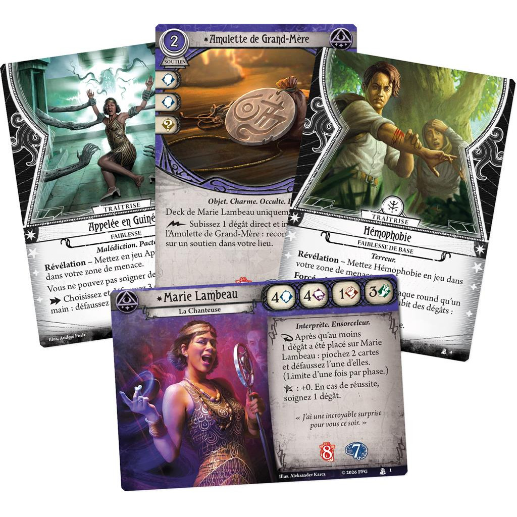 Lorsque les esprits vacillent, Marie Lambeau monte sur scène et entonne un chant envoûtant. Mais derrière la voix se cache un héritage ancien. Descendante d’une lignée de sorcières, elle transforme sa douleur et ses blessures en véritable puissance occulte pour affronter les horreurs du Mythe.Ce deck Investigateur prêt-à-jouer comprend 60 cartes en français, conçues pour exploiter sa capacité unique à convertir les dégâts en ressources stratégiques. Grâce à ses Sorts et à ses soutiens, Marie peut combattre, enquêter et manipuler les forces mystiques en sacrifiant sa propre vitalité. Compatible avec l’ensemble de la gamme Arkham Horror JCE, ce deck enrichit vos stratégies et vos campagnes évolutives. Cette extension est compatible avec la nouvelle édition 2026 de la boîte de base d’Horreur à Arkham : Le Jeu de Cartes, mais pas avec la précédente édition.