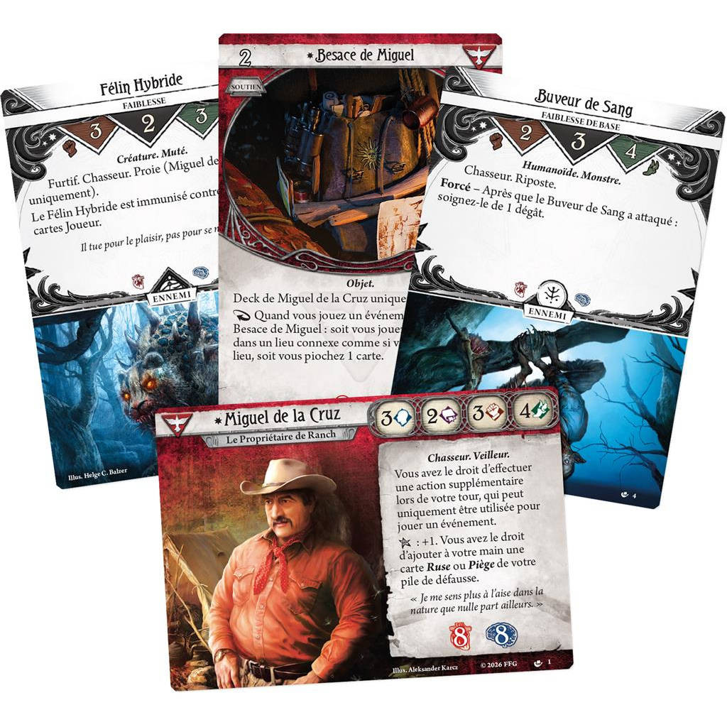 Miguel de la Cruz est un deck Investigateur pour le jeu de cartes Horreur à Arkham. Avec ce paquet de 60 cartes, vous pourrez entamer les quêtes et scénarios du jeu en jouant ce propriétaire de ranch : un Survivant qui n’hésitera pas à traquer et à piéger les plus terribles monstres.Miguel n’aurait jamais pensé se retrouver à gérer un cheptel. Mais aujourd’hui, quelque chose tue le bétail pendant la nuit, laissant des cadavres mutilés un peu partout. Plus étrange encore, cette créature ne tue pas pour se nourrir. Mais Miguel est parfaitement capable de se défendre…Tireur redoutable et survivaliste chevronné, il utilise des événements pour manipuler ses ennemis. Sa capacité lui permet de jouer un événement de plus à chaque tour. Il pourra utiliser son Couteau de Poche, son Chien de Chasse, ses Tactiques de guérilla ou sa Vieille boussole pour vous rapprocher de vos ennemis et les affronter.Attention toutefois au Félin Hybride, la créature qui rôde près de son ranch et est immunisé aux effets de cartes Joueur ! Une faiblesse qu’il devra combler.Cette extension est compatible avec la nouvelle édition 2026 de la boîte de base d’Horreur à Arkham : Le Jeu de Cartes, mais pas avec la précédente édition.