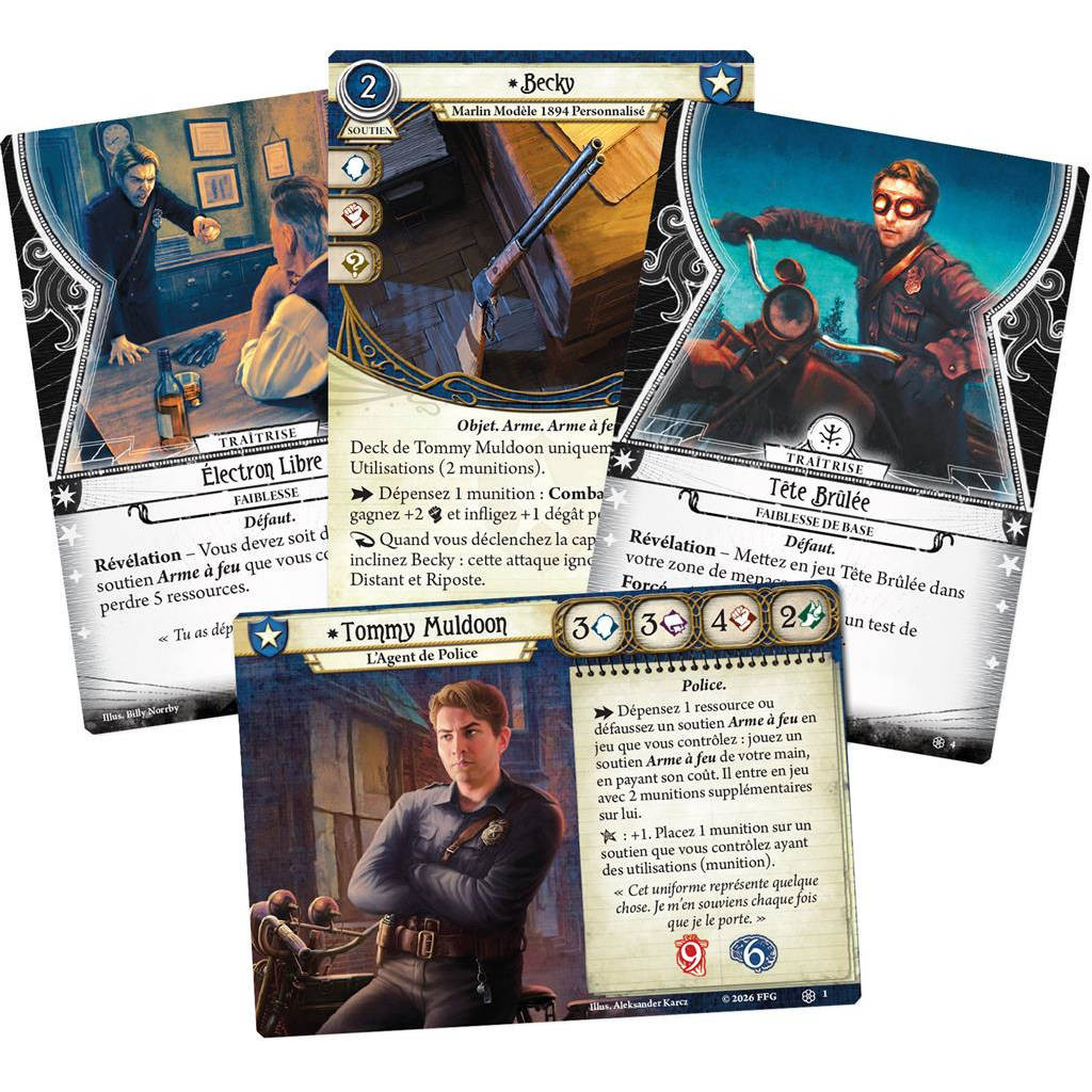 Tommy Muldoon est un deck Investigateur pour le jeu de cartes Horreur à Arkham. Avec ce paquet de 60 cartes, vous pourrez entamer les quêtes et scénarios du jeu en jouant cet Agent de police expert en armes à feu. Un Gardien prêt à protéger les innocents. Certaines cartes pourront être ajoutées à vos autres decks.Lorsqu’il travaillait pour la police de Boston, Tommy pensait que les monstres n’existaient pas. Mais il est persuadé d’avoir vu bien plus de choses que n’importe quel autre membre des forces de l’ordre.Cet investigateur est un Gardien spécialisé en armes à feu. Il peut faire des réserves de munitions et même défausser une arme pour faire en prendre une autre et continuer à faire feu. Il dispose de soutiens lui permettant de garder ses ennemis à distance et ne se déplace jamais sans sa carabine Becky, sa Marlin Modèle 1894. Attention toutefois à ses faiblesses, "Tête brûlée" (qui lui engendre un dégât en cas d’échec à un test) et "Électron libre", qui vous fait défausser vos armes.Cette extension est compatible avec la nouvelle édition 2026 de la boîte de base d’Horreur à Arkham : Le Jeu de Cartes, mais pas avec la précédente édition.