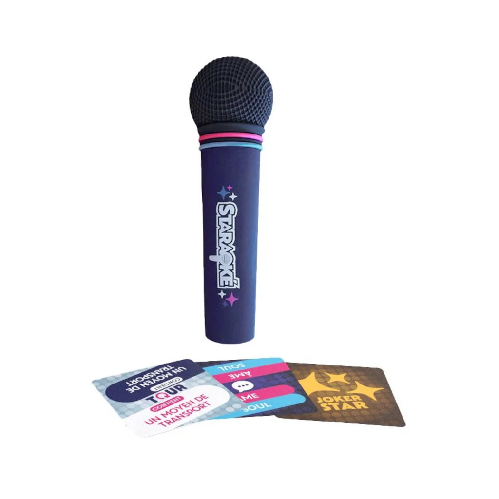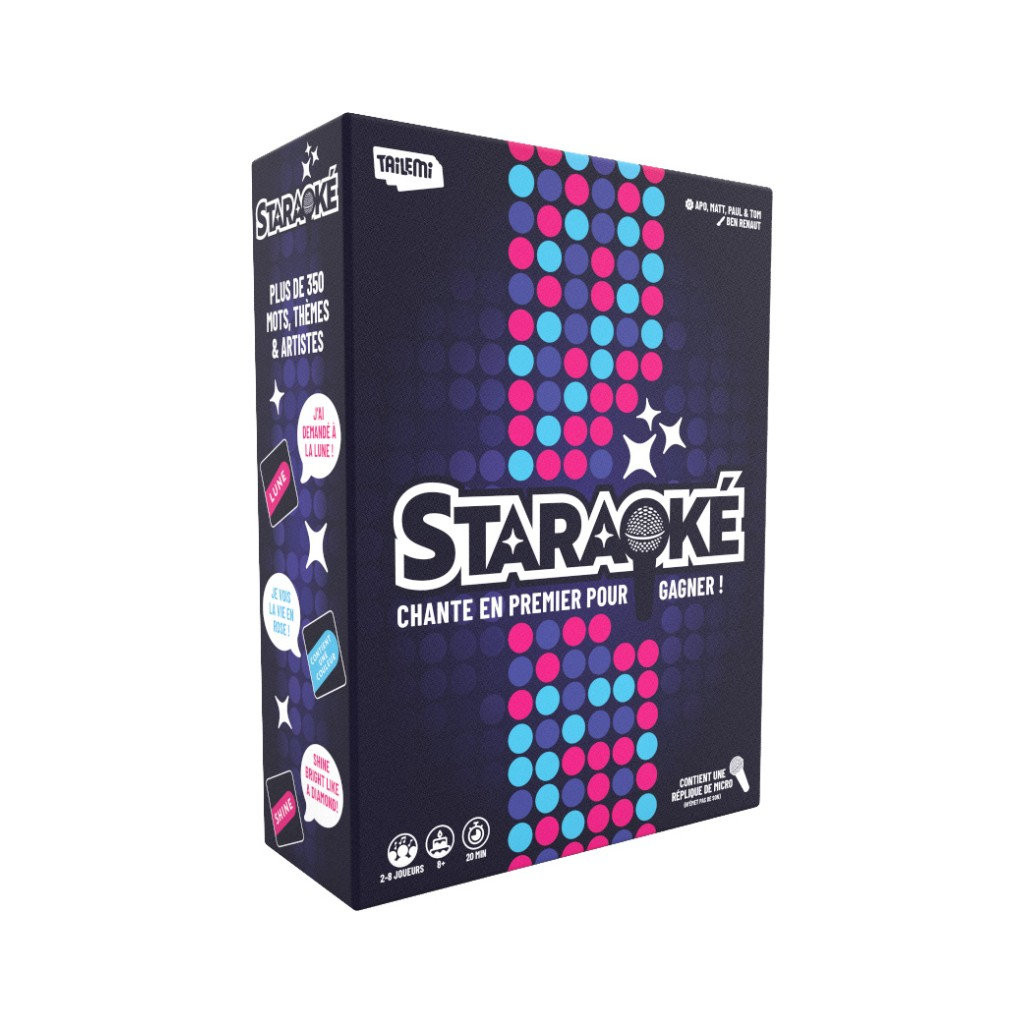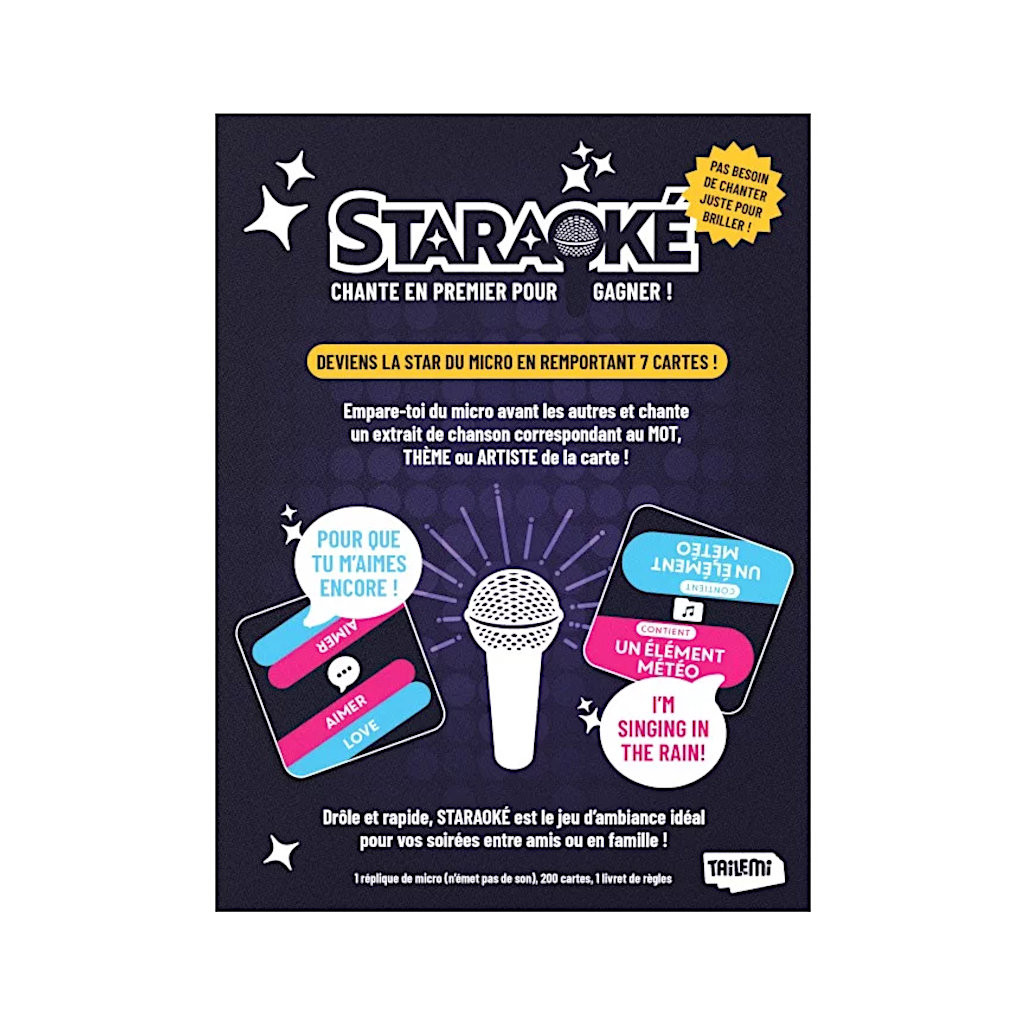 Staraoké est un jeu musical de rapidité où les joueurs doivent chanter un extrait de chanson contenant le mot, le thème ou l'artiste indiqués sur la carte catégorie. Le premier qui attrape le micro et chante un extrait correspondant à la carte catégorie remporte le tour. Des cartes spéciales « Star Tour » contiennent également un mot ou un artiste, mais déclenchent une « mort subite » : à tour de rôle, les joueurs doivent chanter une chanson respectant la catégorie de la carte. Le dernier en lice remporte le tour.