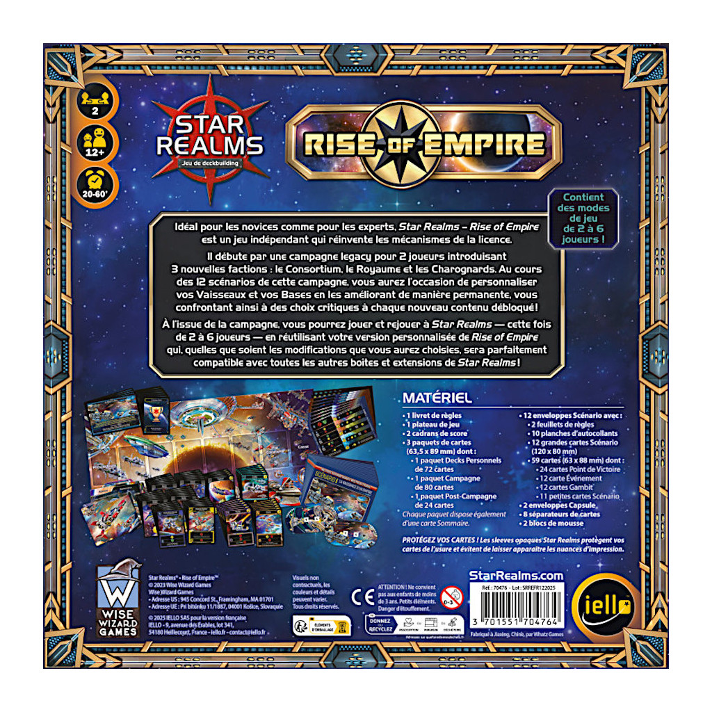 Star Reams – Rise of Empire reprend l’ADN de Star Realms avec undeckbuilding nerveux, désormais associé à une palpitante campagne legacy, assortie d’une montée en puissance grisante. Comme dans le Star Realms classique, chaque joueur commence avec un deck de base et un objectif simple : réduire l’influence adverse à zéro !