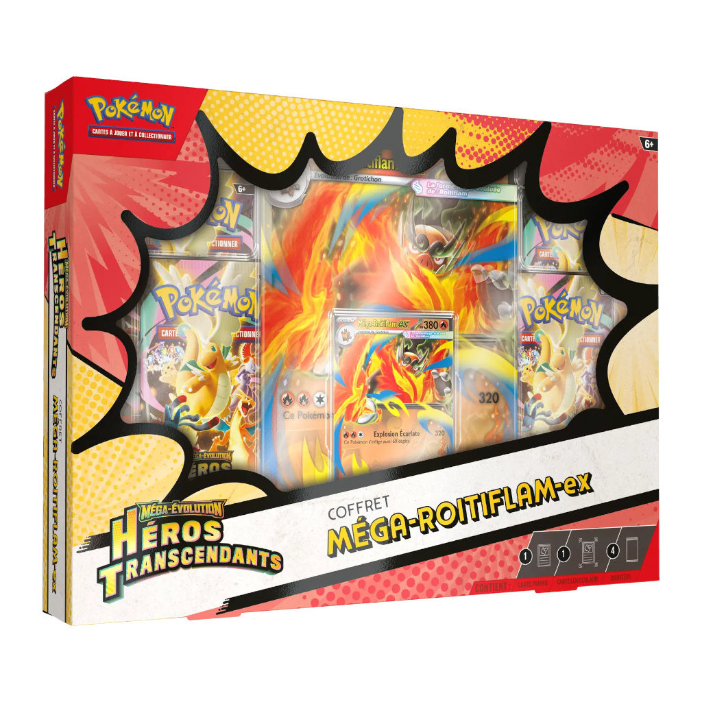 Le Pokémon - Coffret Héros Transcendants - Méga-Roitiflam-ex contient 4 boosters, 1 carte promo et 1 carte grand format.