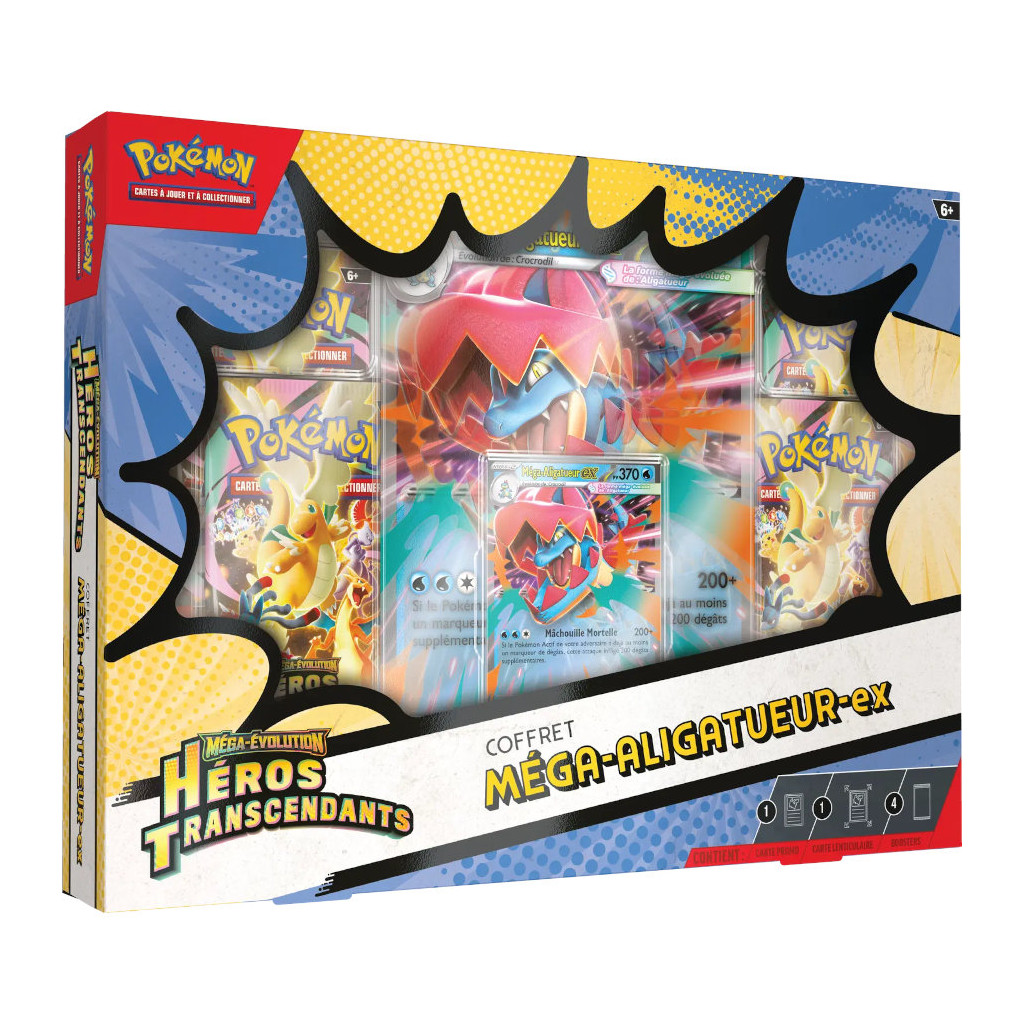 Le Pokémon - Coffret Héros Transcendants - Méga-Aligatueur-ex contient 4 boosters, 1 carte promo et 1 carte grand format.