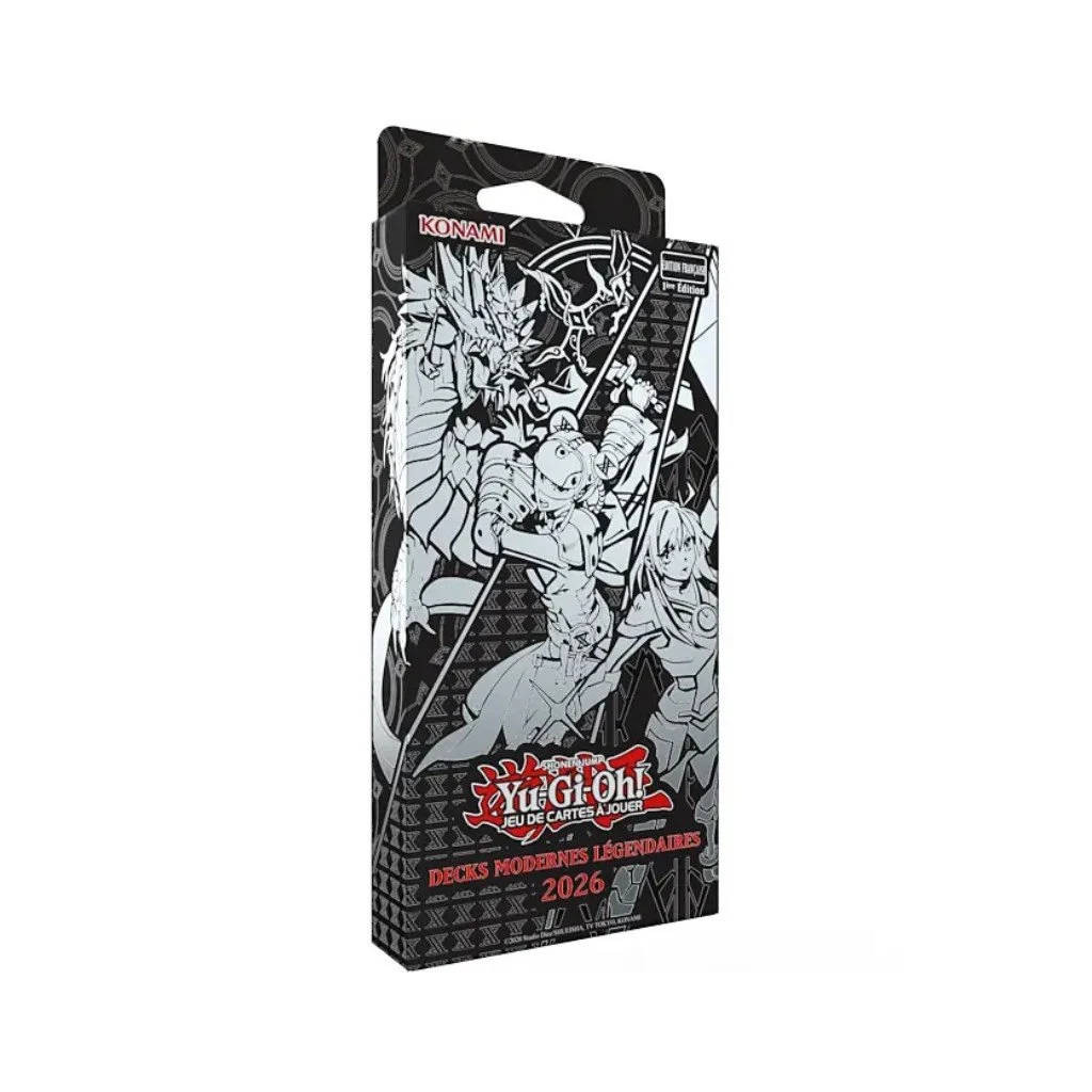 Decks Modernes Légendaires 2026 réunit 3 decks complets et prêts à jouer dans un même coffret, chacun composé de 55 cartes (1 carte secrète rare, 6 cartes ultra rares et 48 cartes communes), plus une 56e carte bonus : un exemplaire supplémentaire de l’une des 6 cartes du deck, avec une chance de l’obtenir en version Starlight Rare ! Chaque deck est conçu pour les tournois, avec un Main Deck et un Extra Deck complets. On y. trouve également des cartes exclusives !L'archétype Assaut de l'air s'est hissé jusqu'en Top 4 des championnats du monde 2025. En plus de toutes les cartes Assaut de l'Air incontournables réunies dans un même produit, vous obtenez un deck de haut niveau avec les nouvelles cartes Sky Striker Ace – Camellia, Prototype Sky Striker Ace – Amatsu, Surgical Striker – S.P.E.C.T.R.A., and Combined Maneuver – Engage Zero!15 ans après leur première apparition dans Arsenal Mystérieux, Gottoms est de retour et son armée l'attend. Retrouvez de nouvelles cartes Sabre X, ainsi que vos cartes préférées dans ce deck remis au goût du joue.La stratégie Mitsurigi basée sur les rituels est apparue il y a moins d'un an avec le booster Ténèbres Suprêmes. Ce coffret Decks Modernes Légendaires 2026 vous fournit tout ce dont vous avez besoin pour vous approprier cette stratégie qui a su s'imposer en tournois.Au total, le coffret Decks Modernes Légendaires 2026 contient 168 cartes réparties en 3 decks, dont 3 Secret Rares, 18 Ultra Rares, 144 Communes, 3 Secret Rares bonus, avec une chance d'obtenir une Starlight Rare à la place.