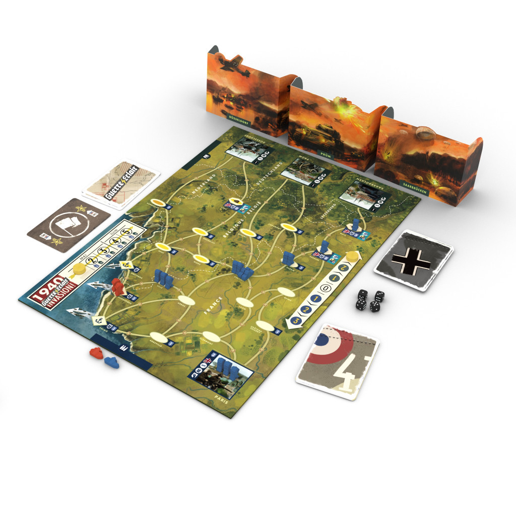 Le 10 mai 1940, mettant un terme à la « Drôle de guerre », l’armée allemande attaque les Pays-Bas, la Belgique et la France suivant les instructions du « Plan jaune ». Malgré toutes les tentatives des Français et des Britanniques pour maintenir une ligne de défense continue, le front est enfoncé à Sedan par les divisions blindées ennemies appuyées efficacement par l’aviation. Le corps expéditionnaire britannique rembarque à Dunkerque et la France signe l’armistice le 22 juin.Guerre Éclair est un jeu pour 2 joueurs d’une durée de 40mn environ. Jouez le camp allemand et montrez vous agressif pour atteindre la mer ou Paris le plus rapidement possible avec vos panzers. Ou au contraire, prenez en main les armées alliées pour organiser une défense solide et mener de puissantes contre-attaques.Contenu :- 1 plateau- 1 règles du jeu- 3 écrans- 37 cartes à jouer- 13 tanks en bois- 25 soldats en bois