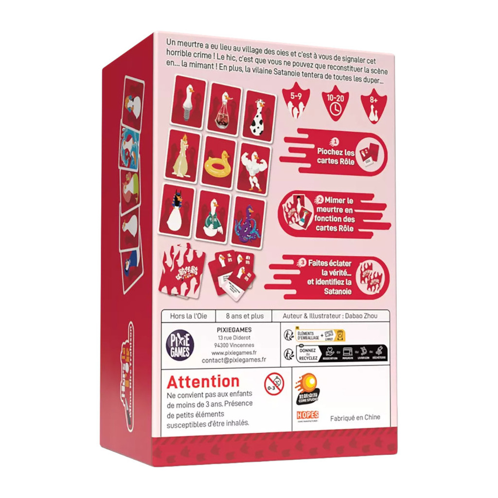 L’Oie Dragon a occis la timide Oie Banane ! Au témoin de s’armer de créativité et de réveiller son voisin pour lui mimer la terrible scène... Est-ce une oie T-Rex qui a achevé la pauvre Oie Falbala, ou bien une oie Mexicaine ? Difficile à dire…