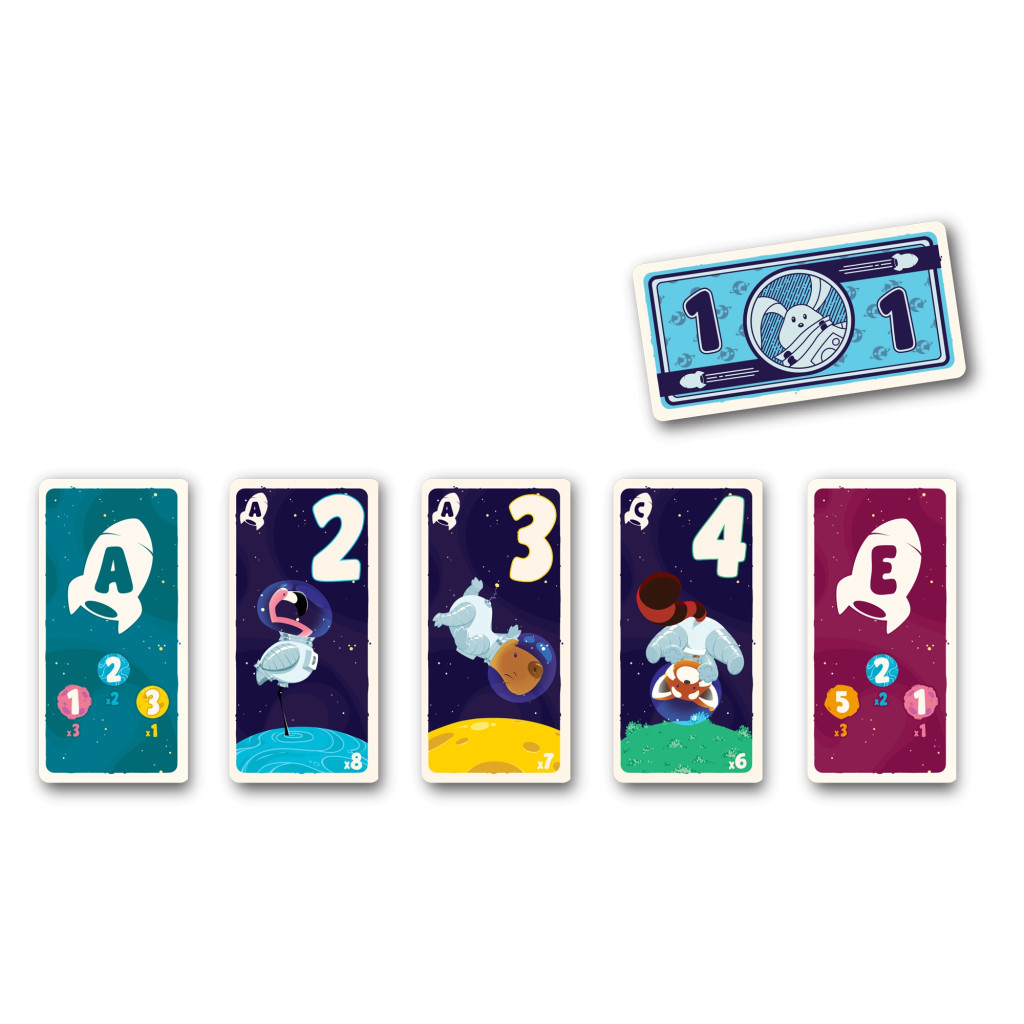 1. Piochez dans l'un des 6 tas et construisez la main la plus puissante possible. Détail : la première et la dernière carte resteront cachées des autres.2. Pariez sur la meilleure main avant de prendre votre cinquième carte !3. La main la plus forte gagne. Vous gagnez également 1 Dollar de l'espace si vous aviez pariez sur la meilleure combinaison.